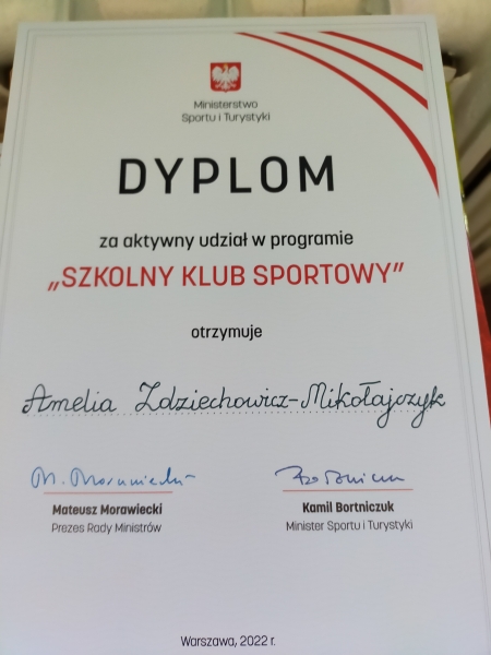 Uczniowie na zakończenie roku szkolnego otrzymali dyplomy za aktywny udział w zajęciach od Ministra Sportu i Turystyki Kamila Bortniczuka i Prezesa Rady Ministrów Mateusza Morawieckiego.