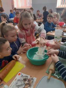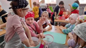 Wszystkie dzieci starannie się przygotowały do zajęć kulinarnych. Najpierw umyły ręce i usiadły do stolików. Następnie poznały składniki, sposób wykonania ciasta oraz przygotowały potrzebne przybory kuchenne.