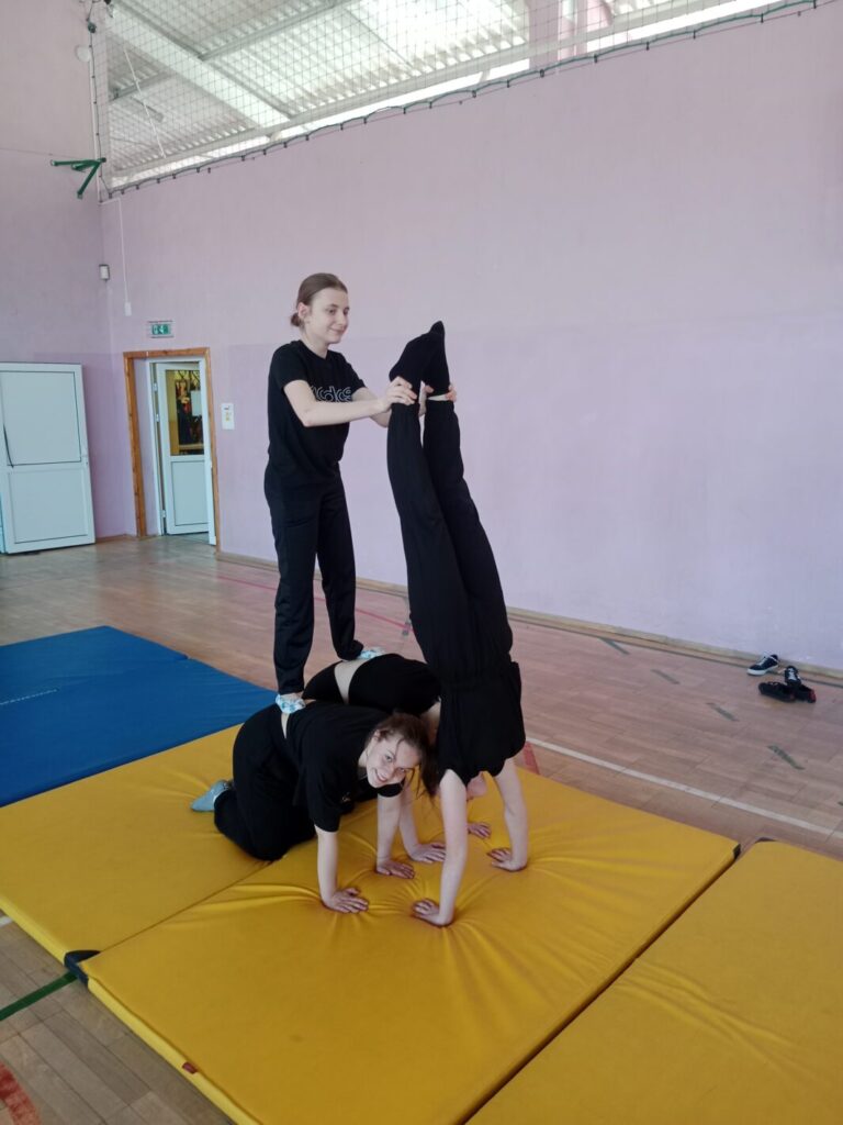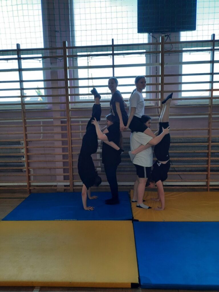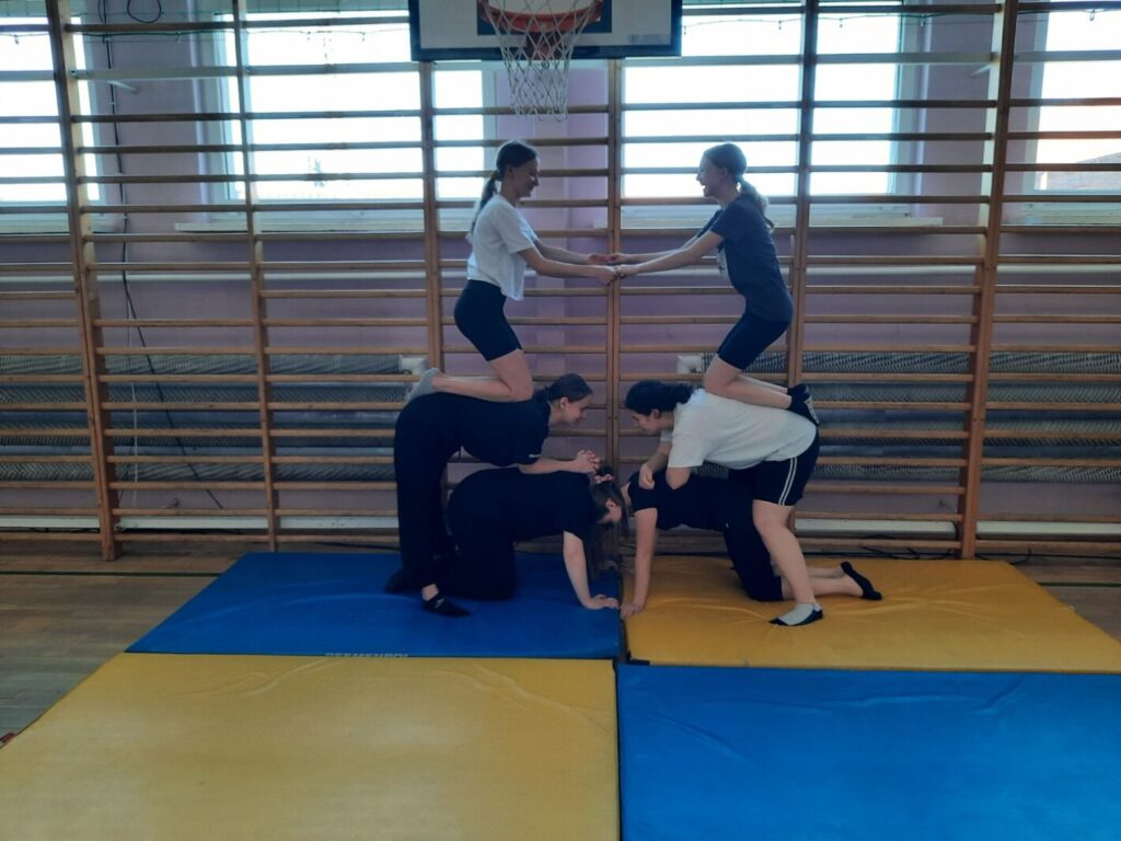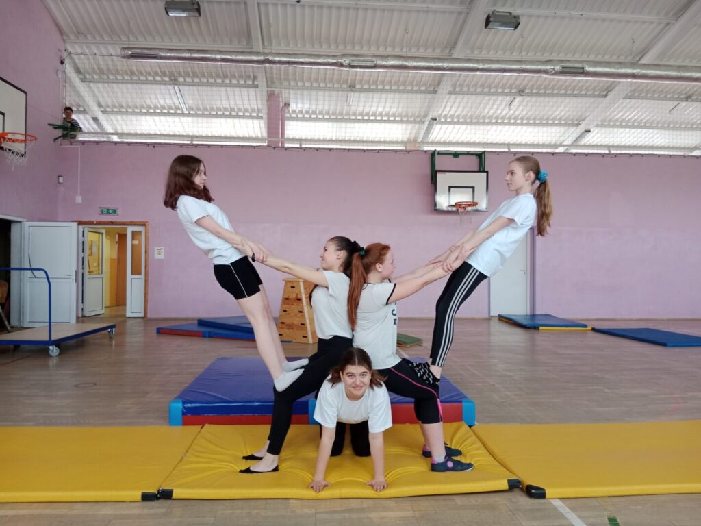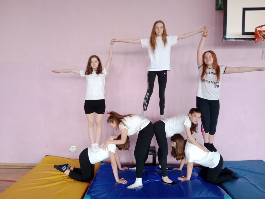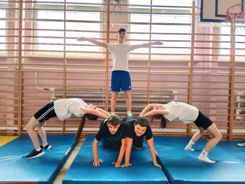 Drugim konkursem był szkolny konkurs gimnastyczny w kategorii piramidy wieloosobowe. Piramidy pozwalają wykorzystać umiejętności gimnastyczne, gibkość, zwinność, równowagę, siłę, koordynację ruchową. Uczestnicy jednocześnie współdziałają w grupie ucząc się polegać na sobie, wzajemnie się asekurować i wspierać w celu stworzenia gimnastycznego pokazu. Budowanie piramid to również okazja do śmiechu i dobrej zabawy. Do zawodów przystąpiły zespoły wieloosobowe z klas 7-8, których zadaniem było wykonanie dwóch piramid. Efekty pracy uczniów zostały uwiecznione na zdjęciach a następnie ocenione przez komisję sędziowską. Po burzliwych obradach wyłoniono zwycięzców konkursu: