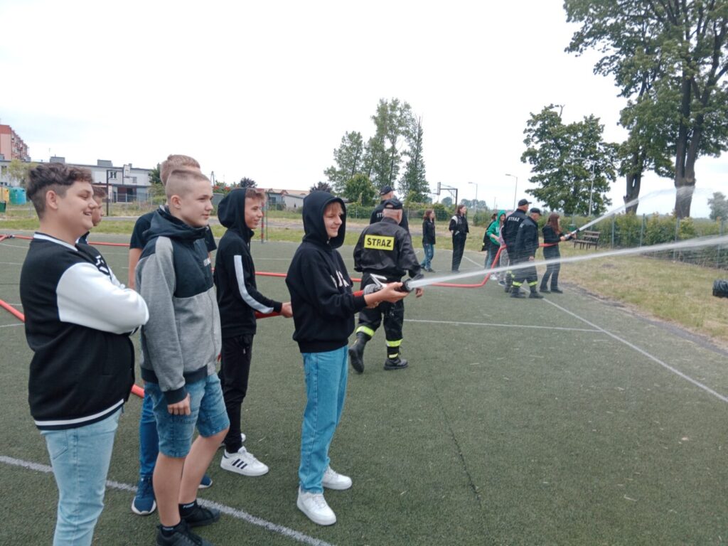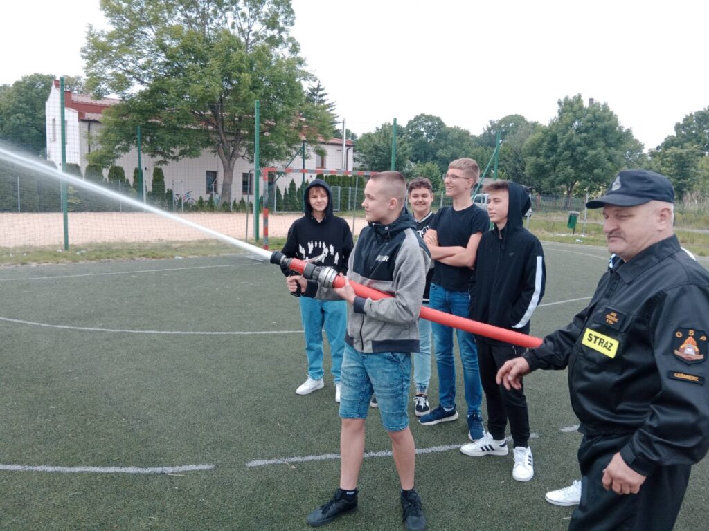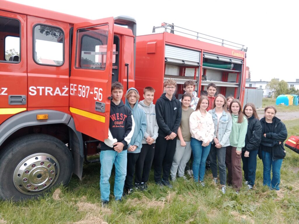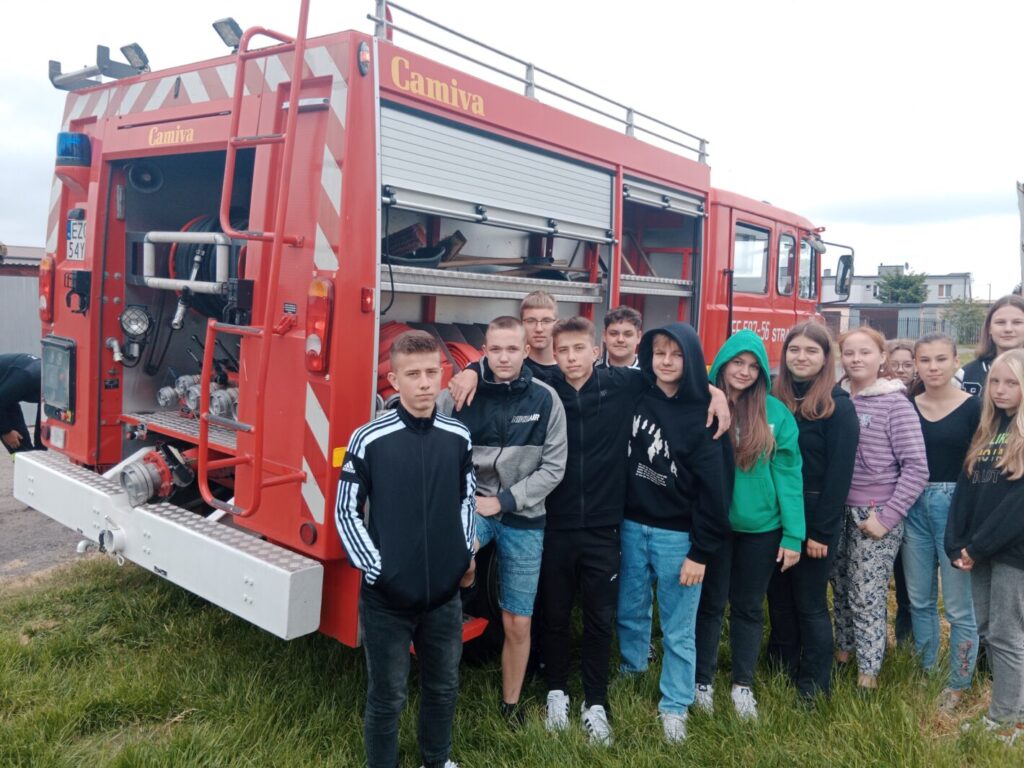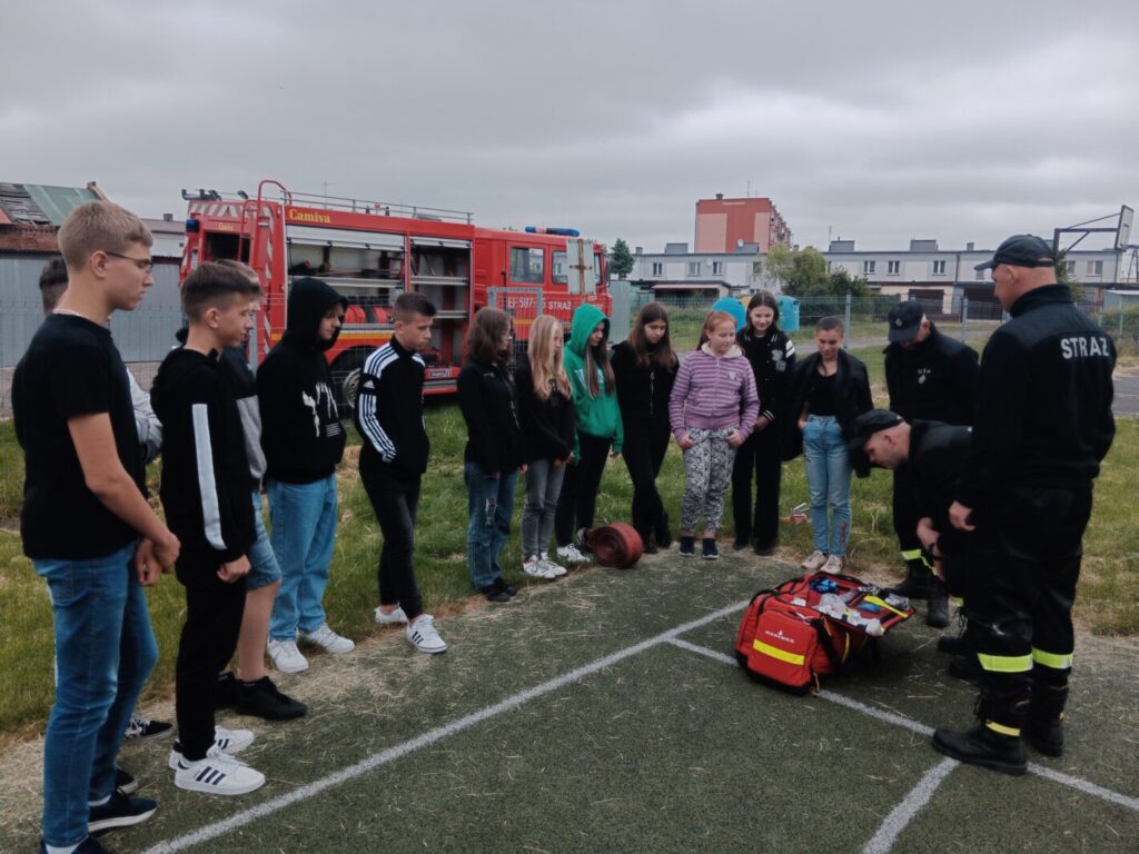 Dnia 2 czerwca w ramach lekcji edukacji dla bezpieczeństwa uczniowie klas ósmych naszej szkoły uczestniczyli w pokazie strażackim zorganizowanym przez Jednostkę Ochotniczej Straży Pożarnej w Leśmierzu. Zajęcia miały na celu propagowanie bezpieczeństwa przeciwpożarowego, zapoznanie się ze sprzętem jakim dysponuje jednostka oraz poznanie specyfiki pracy strażaka. Każdy uczeń mógł zobaczyć z bliska a nawet dotknąć urządzeń używanych podczas akcji. Strażacy zaprezentowali możliwości samochodu oraz sprzętu znajdującego się na jego wyposażeniu. Omówione zostały także zasady pierwszej pomocy przedmedycznej. Na koniec pokazu uczniowie zostali poinformowani o trwającym naborze do OSP w Leśmierzu, poznali ofertę i wymagania dla kandydatów.