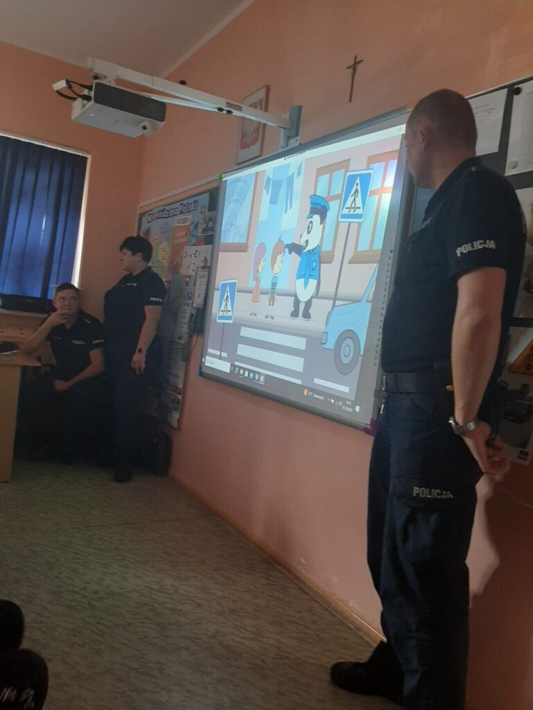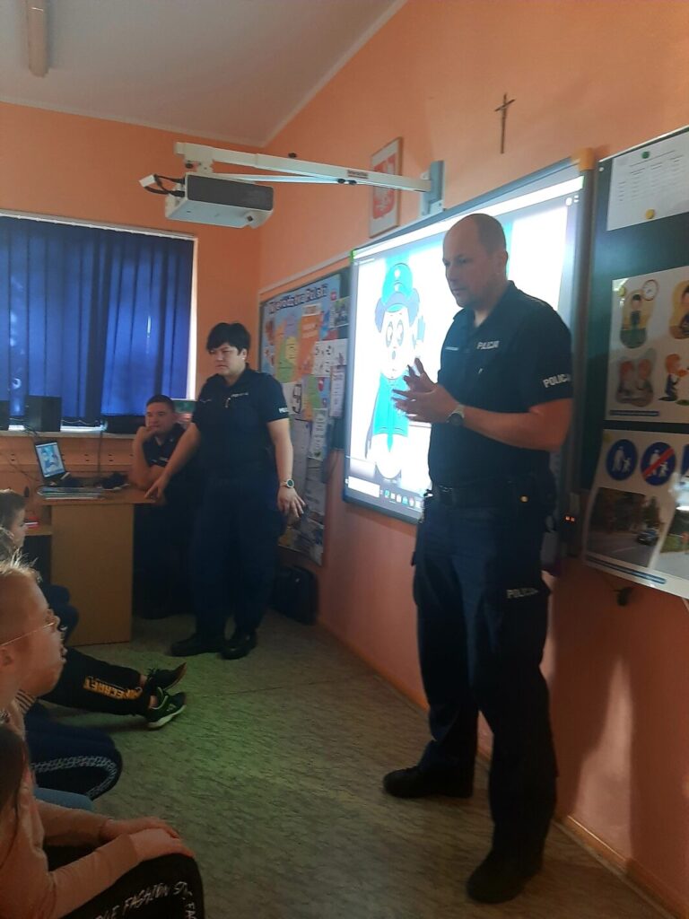 Policjanci rozmawiali z dziećmi o podstawowych zasadach bezpieczeństwa w ruchu drogowym, podkreślili ważną rolę elementów odblaskowych, które każdy uczeń powinien posiadać. Przypomnieli również zasady jakie należy stosować w kontaktach z obcymi. Ponadto funkcjonariusze poruszyli temat cyberprzemocy i skutków, jakie może nieść za sobą niewłaściwe korzystanie z Internetu.