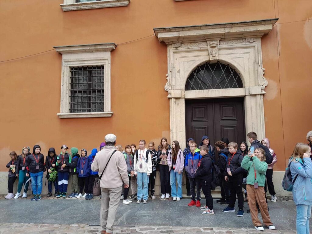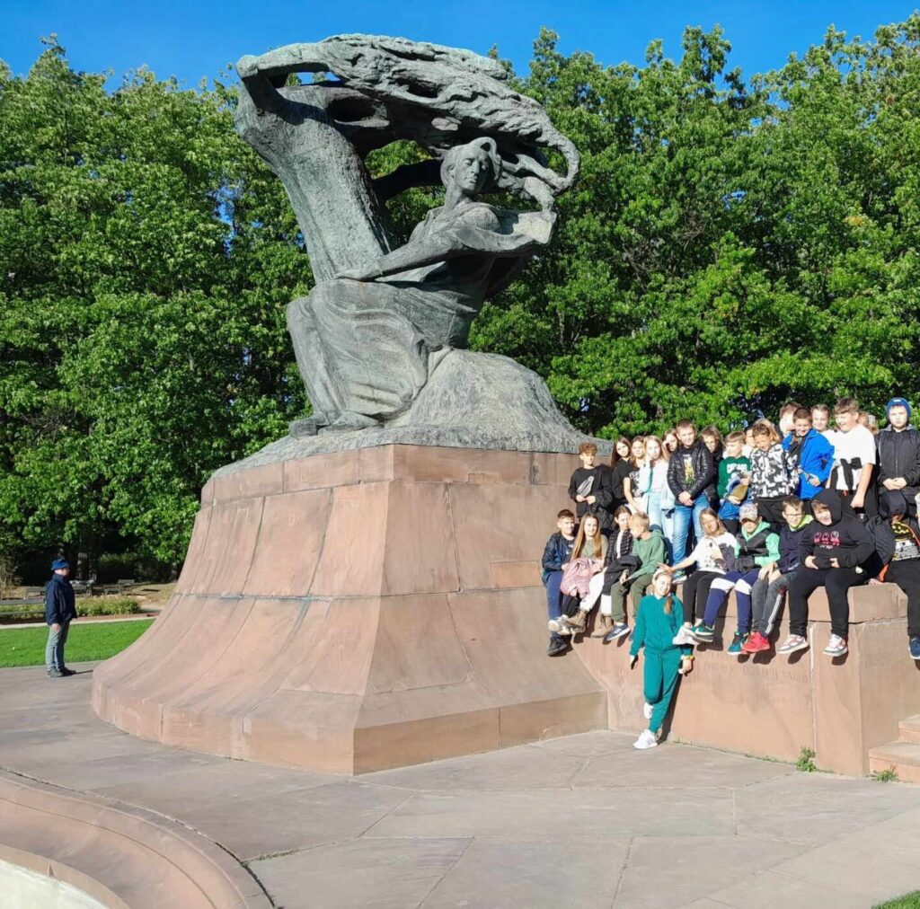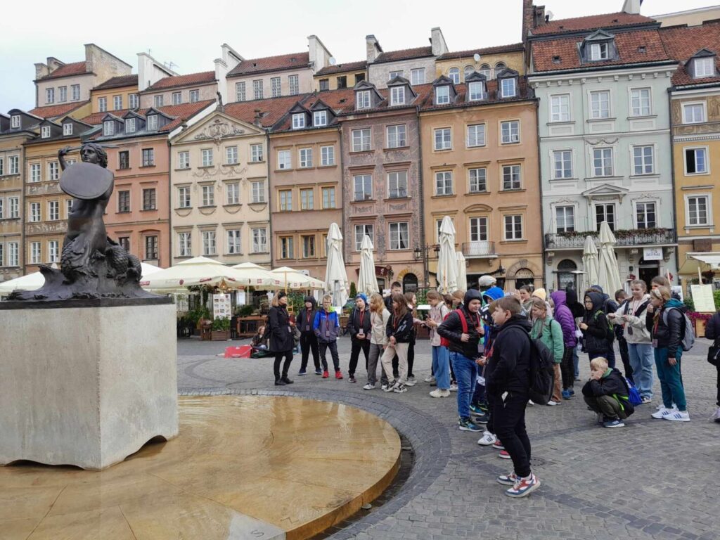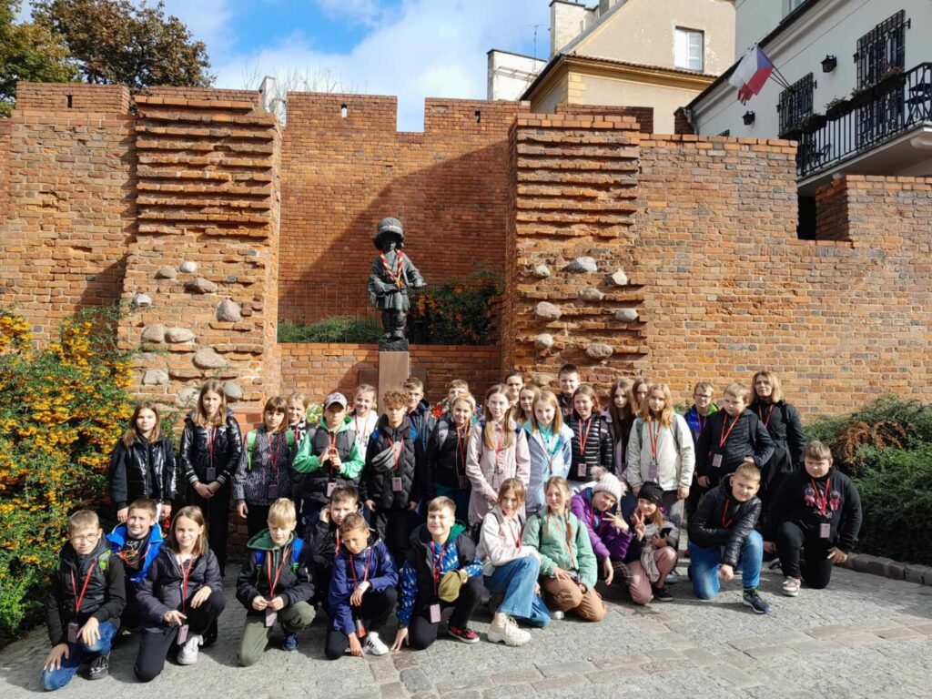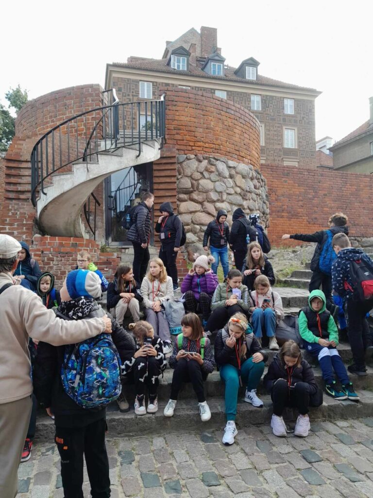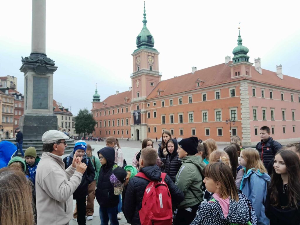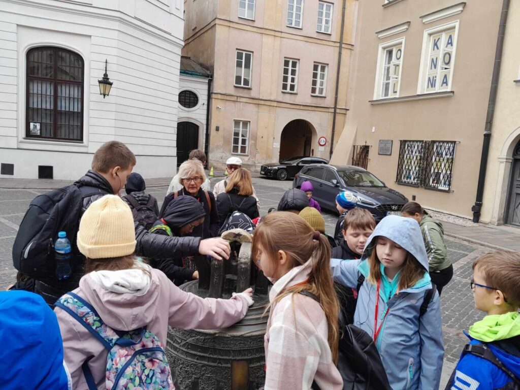 W dniu 6 października 2023 roku uczniowie klas 4 i 5 z opiekunkami panią Marią Graczyk, panią Ewą Wiśniewską i panią Jolantą Kuropatwą udali się na wycieczkę edukacyjną “Warszawa zaczarowana w baśniach, bajkach i legendach”. Pan Lech Waszczuk, warszawski przewodnik, poprowadził nas na Stare Miasto, do miejsc znanych i chętnie odwiedzanych przez mieszkańców i turystów. Najciekawsze były tajemnicze zakamarki w zaułkach zabytkowych uliczek, związane z podaniami i legendami, dotyczącymi odległej historii naszej stolicy. Przypomnieliśmy sobie legendę o Syrence Warszawskiej, Warsie i Sawie, Złotej Kaczce, Bazyliszku. Wysłuchaliśmy opowieści o Michale Piekarskim i zamachu na króla. Poznaliśmy historię szabli Zygmunta III Wazy, Gołębiarki o złotym sercu z ul. Piwnej oraz losy kamiennego niedźwiedzia drzemiącego na stopniach Archikatedry Warszawskiej. Obejrzeliśmy Barbakan, mury miejskie i fosę, rozmawiając przy okazji o obronie dawnych miast przed wrogami. Dowiedzieliśmy się również, gdzie stoi dzwon, który spełnia życzenia. Następnie swoje kroki skierowaliśmy do Łazienek Królewskich, w których podziwialiśmy pomnik Fryderyka Chopina, Henryka Sienkiewicza, Pałac na Wyspie, świątynię Sybilli, Starą Pomarańczarnię (inaczej nazywana Starą Oranżerią). Słoneczna pogoda zachęciła nas do spaceru po parku, gdzie cieszyliśmy się towarzystwem wiewiórek i pięknych pawi.