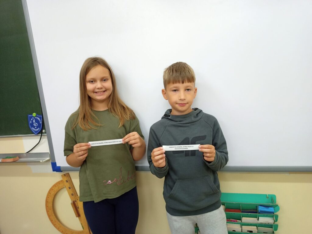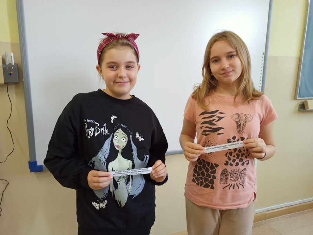 Każdego, kto jeszcze nie dołączył do zabawy (a bardzo by chciał), zapraszam do biblioteki po odbiór karty uczestnika wyzwania. Przypominam, że za zaliczenie całego challenge’u uczniowie otrzymają niespodziankę, a zaliczenie polega na przeczytaniu 10 książek spełniających 10 wylosowanych warunków, tzw. wyzwań. Losowania odbywają się na początku miesiąca, dokonują ich uczniowie poszczególnych klas. Do tej pory byli to: Ksenia Kaszuba i Jan Grochowina z klasy III oraz Maria Kafarska i Maja Jaskuła z klasy V. Wylosowane przez nich wyzwania brzmią następująco: