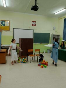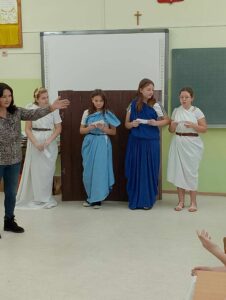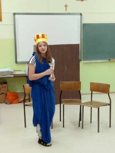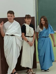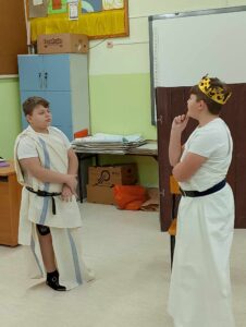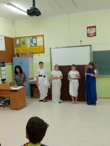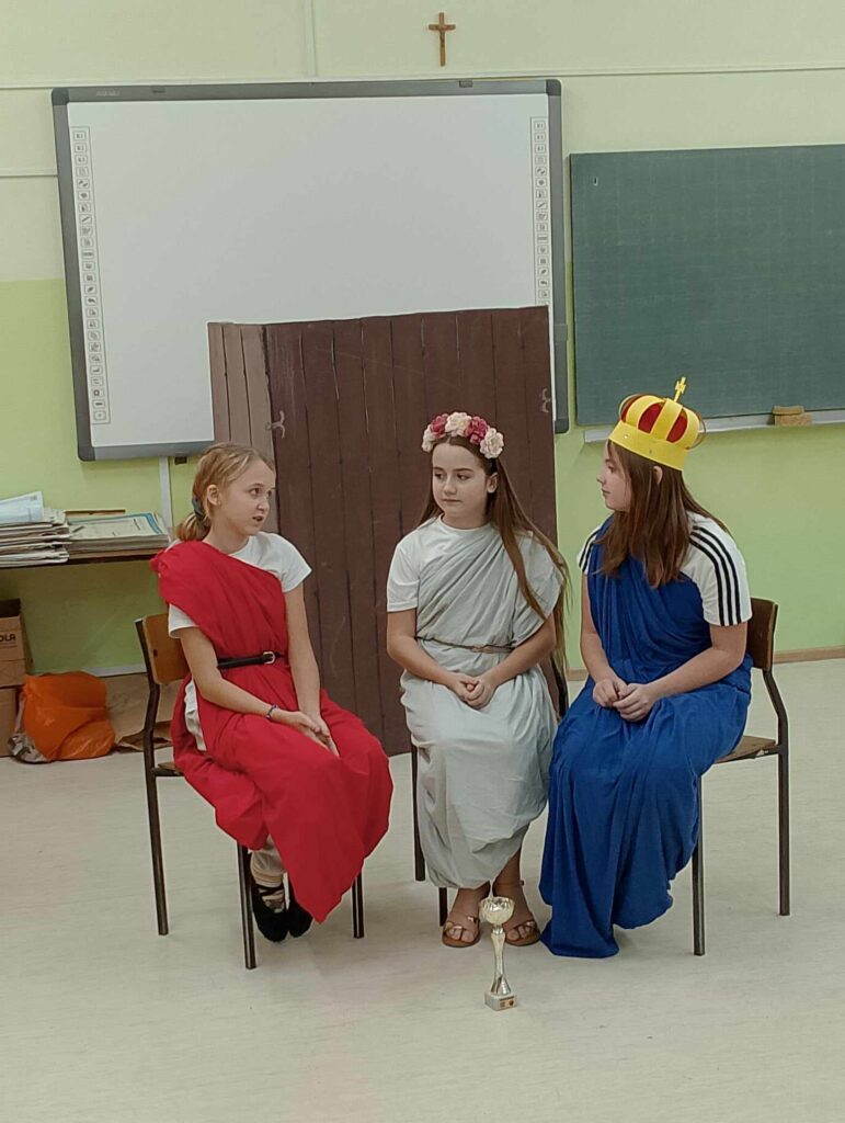 Uczniowie klasy 5 w dniu 29 listopada zamienili salę lekcyjną w Olimp, szkolny strój na kreacje bogów, herosów i bogiń greckich. Widzowie mogli poznać los dobroczyńcy ludzkości – Prometeusza, przyjaciela bogów, powiernika ich sekretów- Syzyfa, pierwszego w dziejach ludzkości konstruktora – Dedala, króla, który wszystko zamieniał w złoto – Midasa. Ciekawe pomysły realizacji poszczególnych mitów dostarczyły nie tylko wielu wrażeń, ale przede wszystkim dobrej zabawy. Konkurs odbył się w bardzo miłej atmosferze, o czym można się przekonać oglądając zdjęcia. Jury w składzie p. Katarzyna Modlińska, p. Aneta Jeziorska, p. Elżbieta Skonieczka, p. Przemysław Padechowicz po naradach przyznali laur zwycięstwa zespołowi ukazujący los Midasa – króla Frygii, który ponad wszystko ukochał złoto, gdzie w role bohaterów wcielili się: Maja Jaskuła, Emil Olejniczak, Łukasz Dudkiewicz, Łukasz Czapliński. Gratulacje należą się wszystkim zespołom za pomysłowość, kreacje aktorskie, interpretacje.