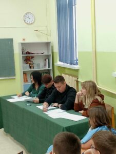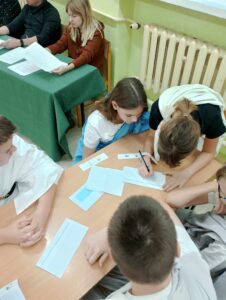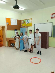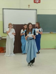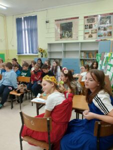 Po konfrontacjach teatralnych uczniowie przystąpili do konkursu wiedzy z treści poznanych mitów na lekcjach języka polskiego. Rywalizowali w siedmiu konkurencjach, w których mogli wykazać się znajomością związków frazeologicznych, umiejętnością wyrażania treści za pomocą pantomimy czy rozwiązywania rebusów. Bogini wiedzy – Atena cały czas czuwała nad śmiałkami, którzy bezbłędnie odpowiadali na pytania, rozwiązywali zadania. Jury p. Katarzyna Modlińska, p. Patrycja Sławska, p. Elżbieta Skonieczka, p. Przemysław Padechowicz wyłoniło zwycięski zespół – Lenę Olczak, Lenę Basiewicz, Roksanę Stawicką, Alexa Bakalarza.
