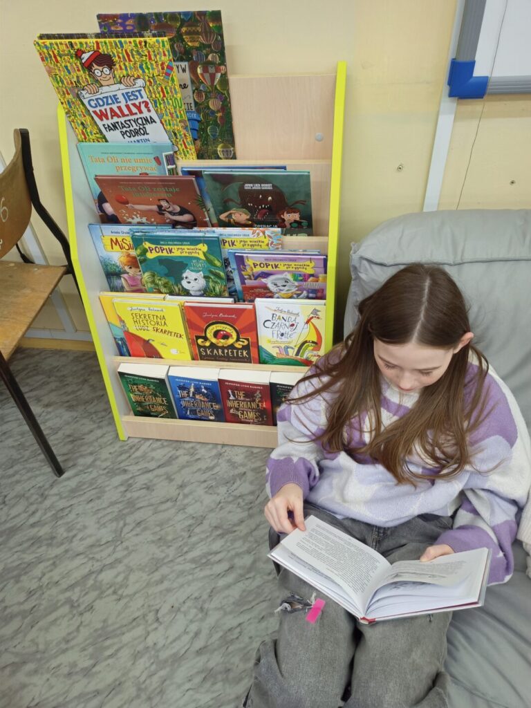 Biblioteka szkolna, dzięki dotacji z Narodowego Programu Rozwoju Czytelnictwa 2.0 na lata 2021-2021 Priorytet 3 została wyposażona w wygodne pufy-siedziska, okrągłe poduszki, niewielki regalik na nowości czytelnicze, stolik oraz dwa pojemniki na książki dla najmłodszych czytelników. Nowe meble utworzyły kącik czytelniczy, z którego mogą korzystać wszyscy uczniowie, zarówno w czasie przerw, jak i czasu wolnego od lekcji.