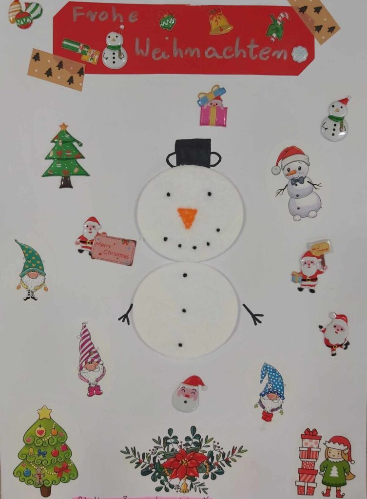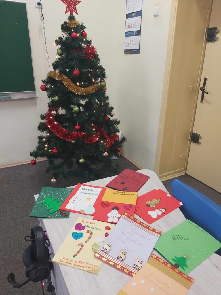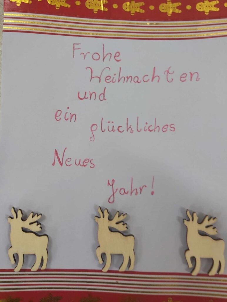 Ostatnie dni przed przerwą świąteczną to oczywiście okazja do poznania, przypomnienia lub utrwalenia słownictwa, zwrotów i wyrażeń na lekcjach języka niemieckiego związanych ze świętami Bożego Narodzenia. To czas, kiedy przypominamy sobie tradycje bożonarodzeniowe również w krajach niemieckojęzycznych. To także moment, kiedy śpiewamy piosenki świąteczne i oglądamy historie wigilijne w tym języku. W tym czasie dekorujemy też nasze tablice językowe w klasach i na korytarzach. To w końcu odpowiednia pora na wykonanie przepięknych kartek świątecznych z życzeniami Wesołych Świąt i Szczęśliwego Nowego Roku, które przekazują dla Was klasy 5 i 6.