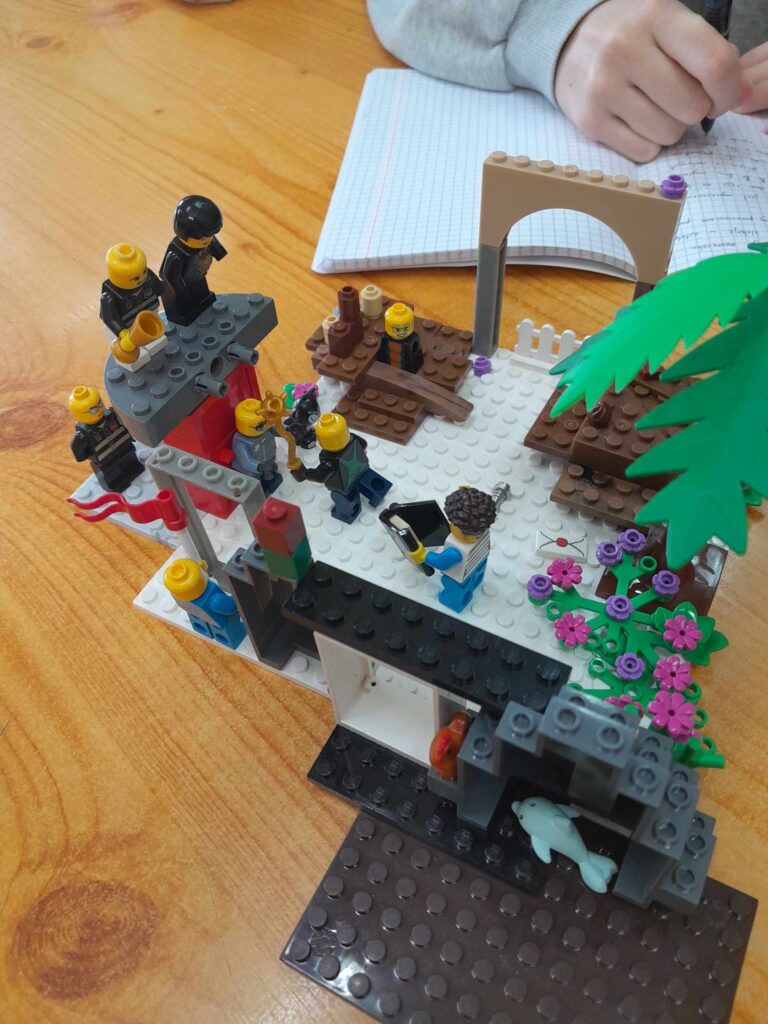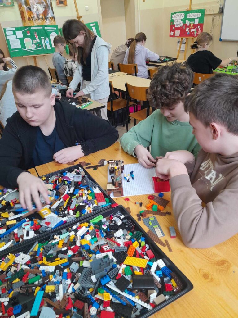 Uczniowie z klasy 5 z zaangażowaniem pracowali nad wizualizacją bitwy, jaką chłopcy z Placu Broni stoczyli z Czerwonymi Koszulami przy pomocy klocków LEGO.