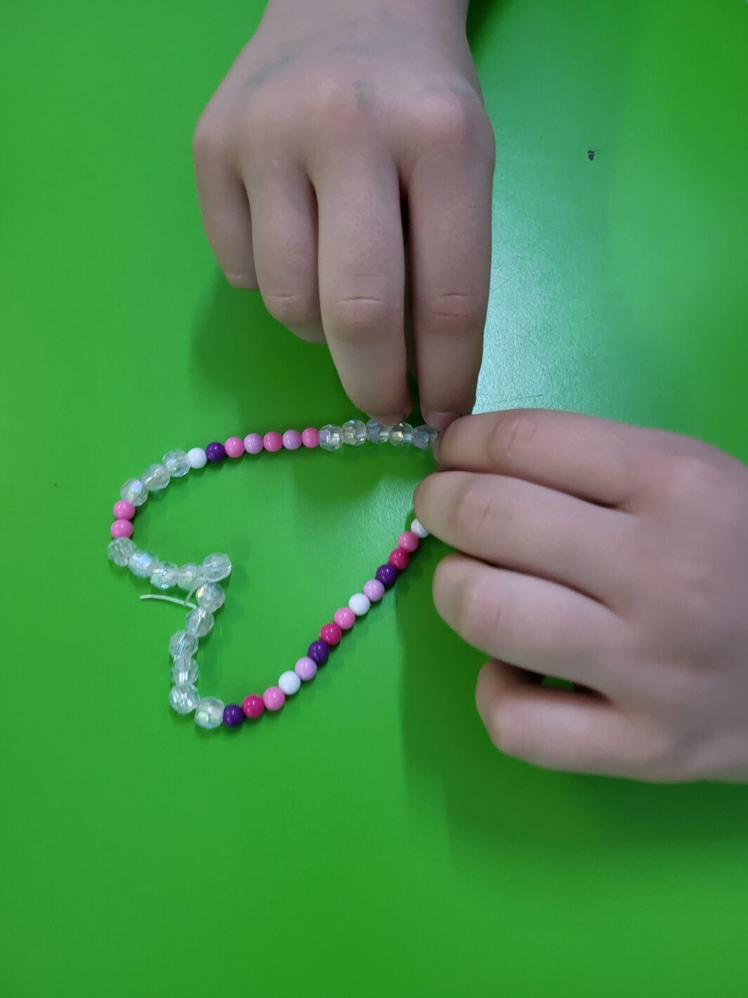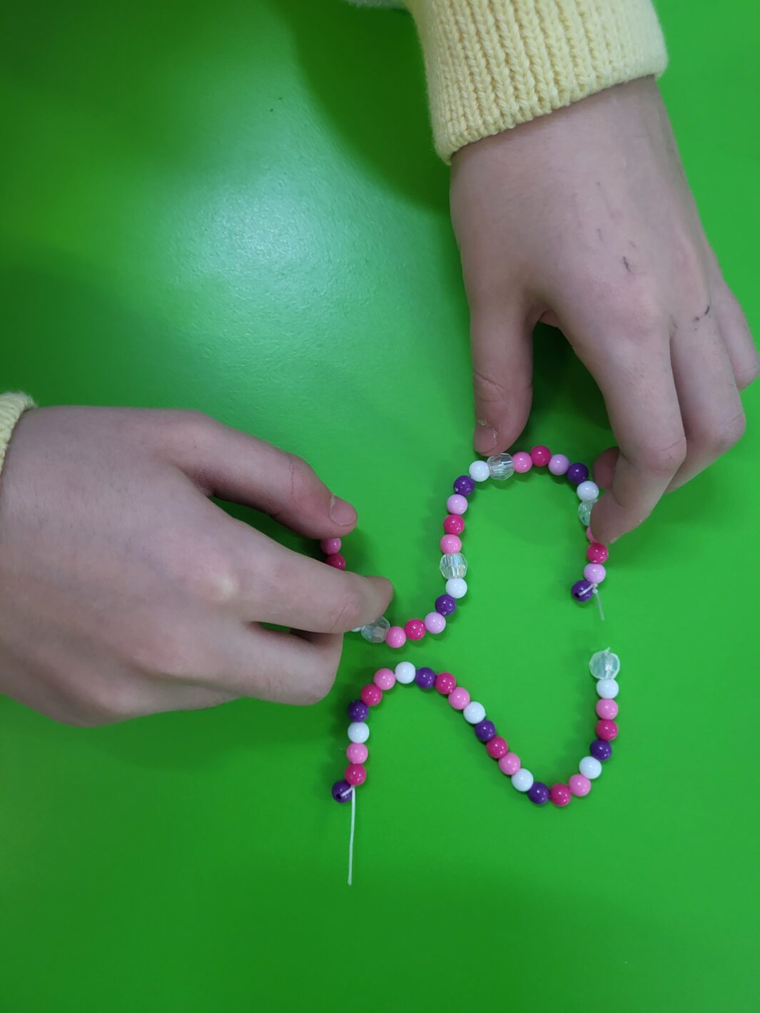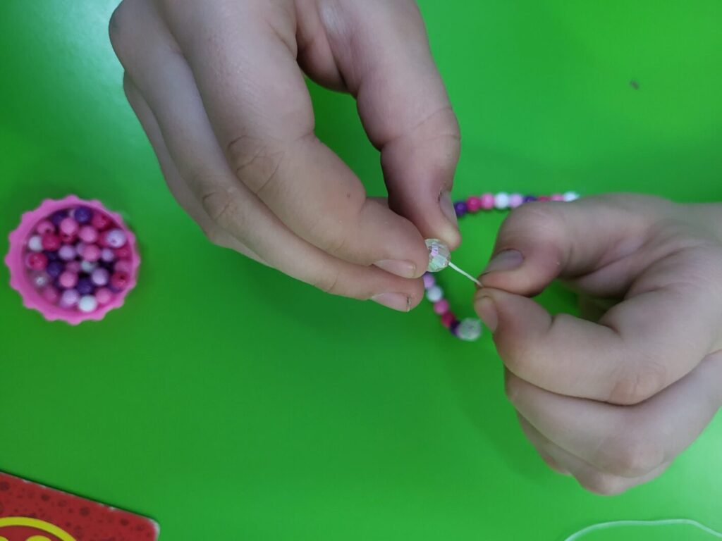 My dodatkowo w trakcie utrwalanie głoski urozmaiciliśmy zadanie i zaangażowaliśmy nasze ręce do tworzenia obrazu graficznego głoski z koralików nawleczonych na sznurek.