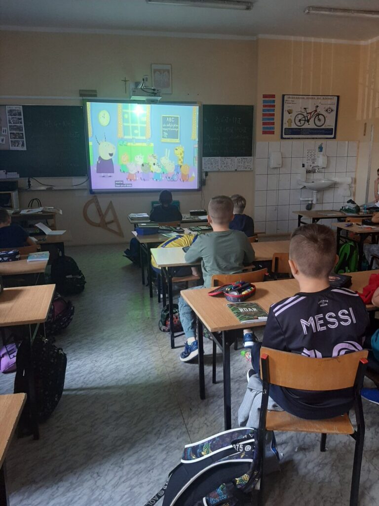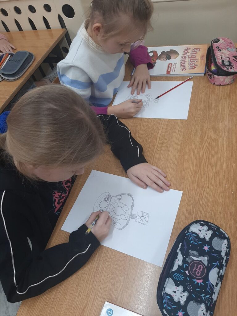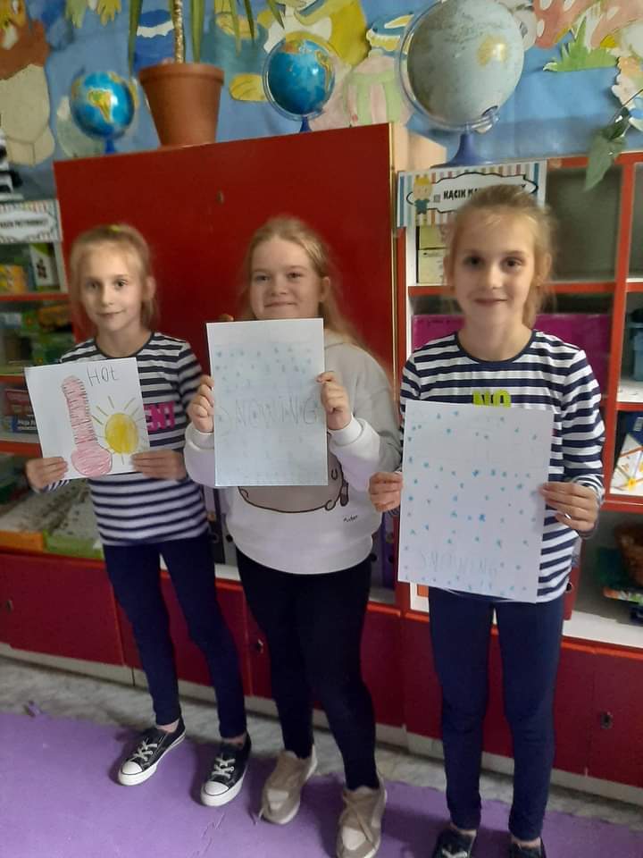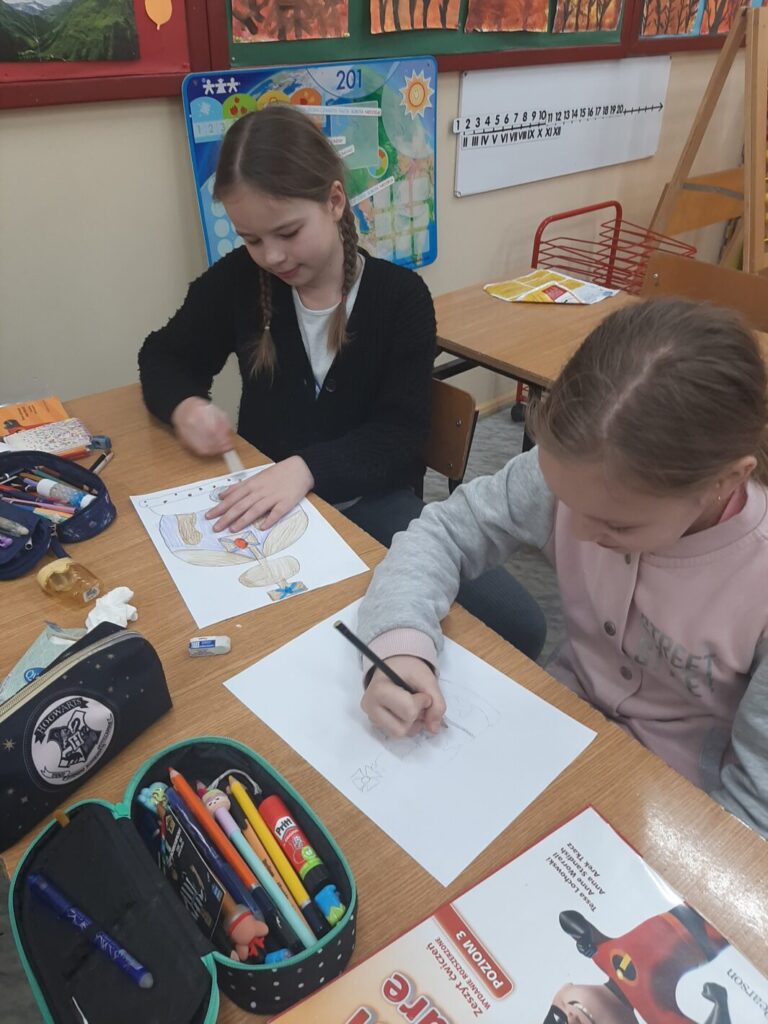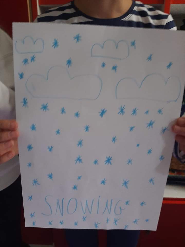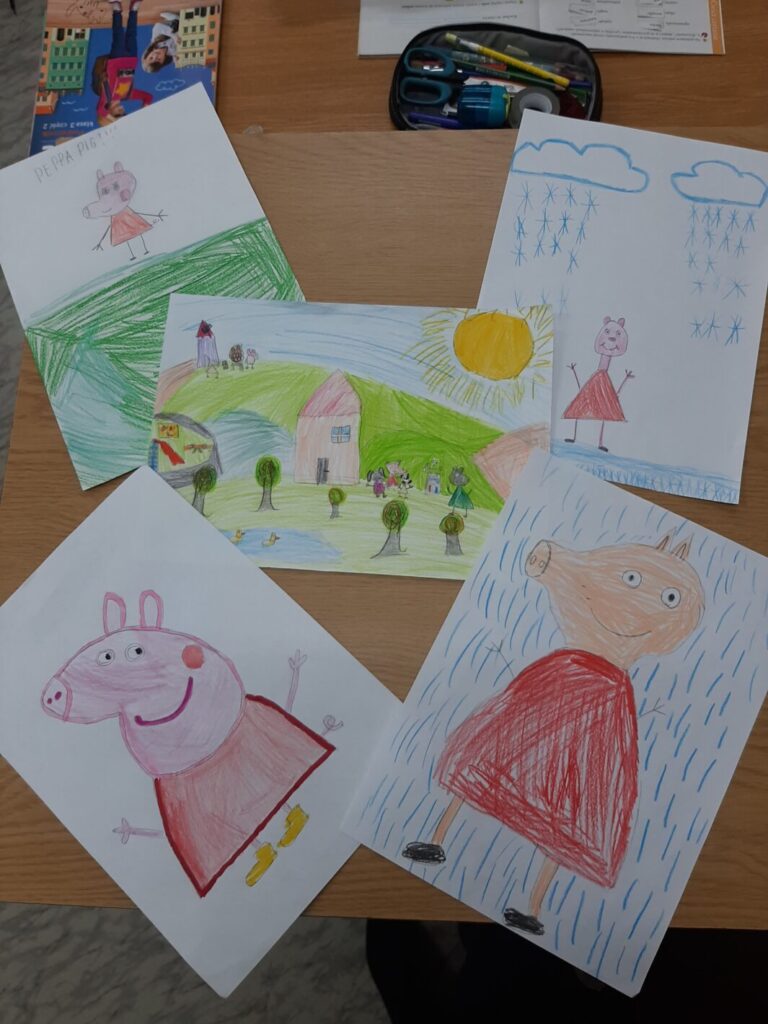 - Bajkowe czary mary – obejrzenie bajki anglojęzycznej i przygotowanie ilustracji do treści, była to bajka „Peppa pig, weather station”.