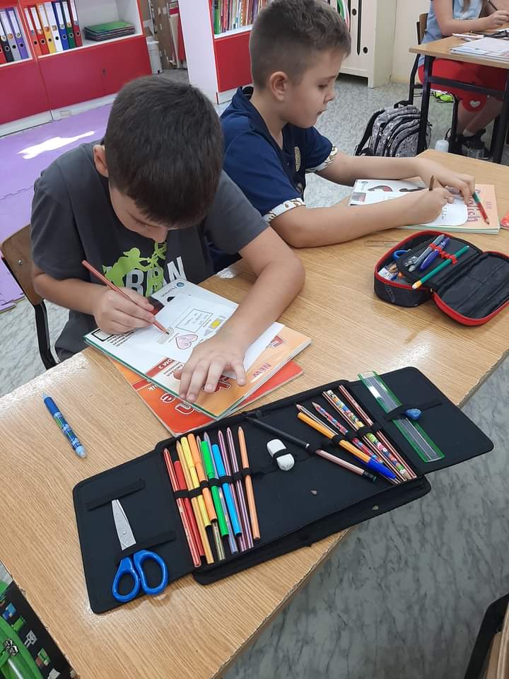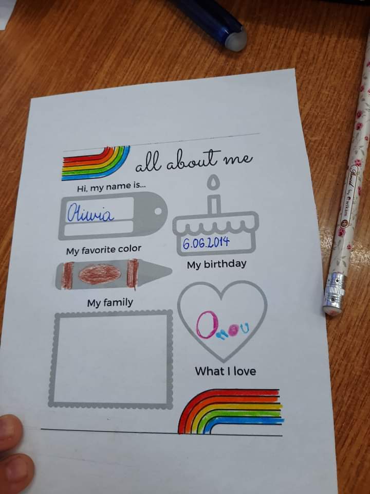 - Book about me – stworzenie książki o sobie, w której uczniowie pisali swój wiek, opisywali swoją rodzinę, podali ulubiony kolor, owoc/warzywo.