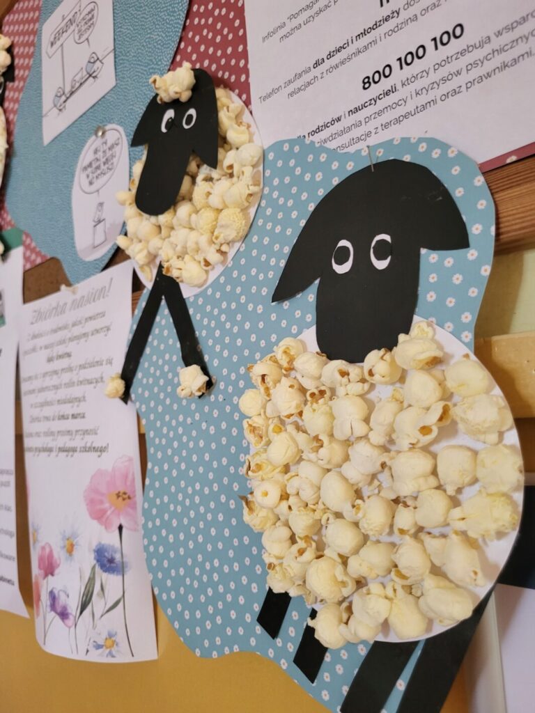 Świąteczny klimat ogarnął również uczniów klas I – III, którzy wykonali ćwiczenia logopedyczne z użyciem popcornu. Przy okazji udało nam się trochę podjeść i wykonać popcornowe baranki wielkanocne.