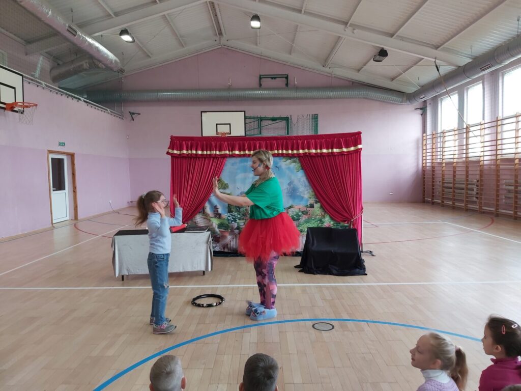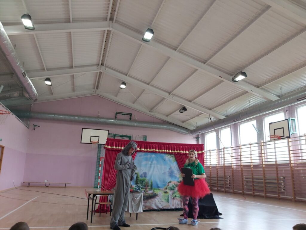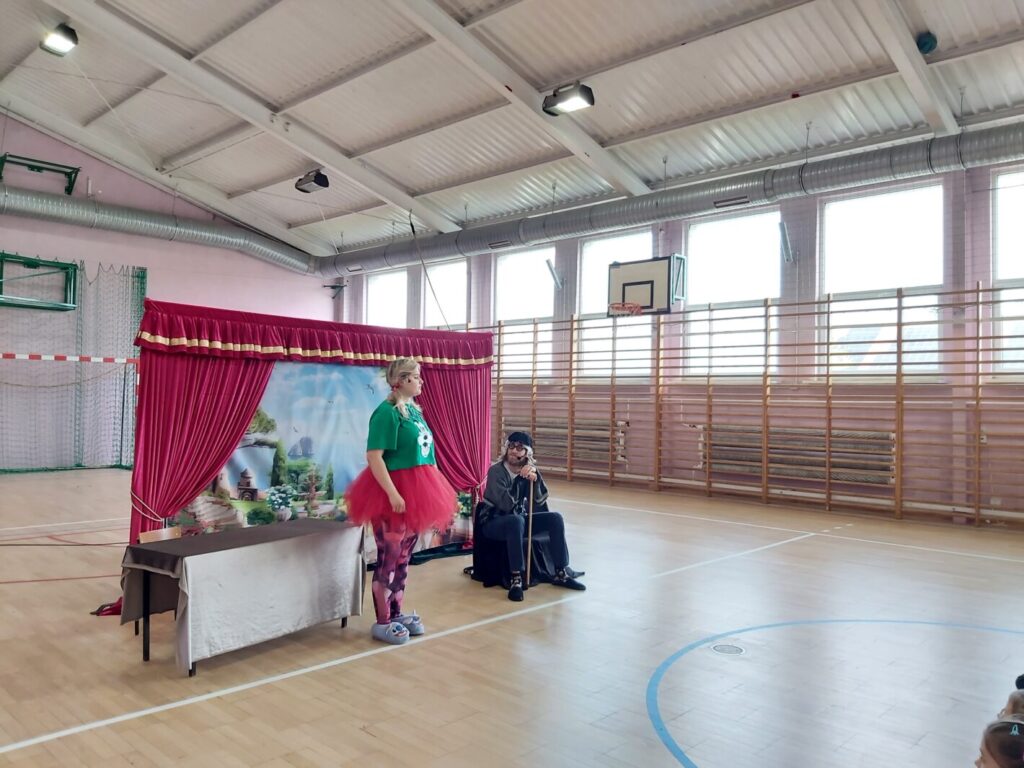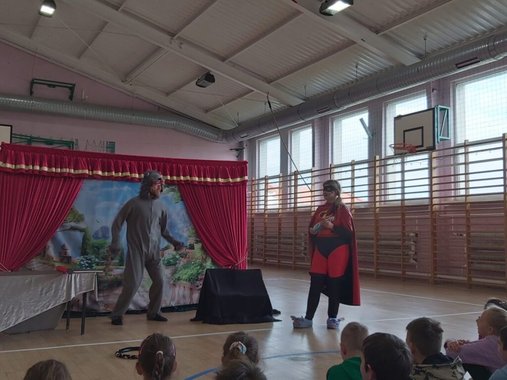W dniu 16.04.2024 r. gościliśmy w naszej szkole aktorów Teatru” Magiczna Scena” z Krakowa, którzy wystąpili w spektaklu profilaktycznym pt. „Księga życzeń”. To wypełniona akcją i muzyką bajka, mówiąca o przyjaźni, dobrym zachowaniu, a w szczególności o szacunku do starszych i drugiego człowieka. Główną bohaterką przedstawienia była przebojowa dziewczynka o imieniu Zosia na którą czekała cała masa niesamowitych przygód, podczas których dziewczynka musiała podejmować trudne decyzję, wykazać się rozsądkiem i wiedzą zdobytą w domu i szkole. Przedstawienie bardzo podobało się naszym uczniom, którzy z wielkim zaangażowaniem w nim uczestniczyli.