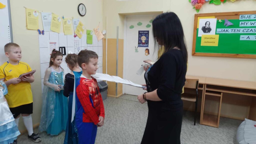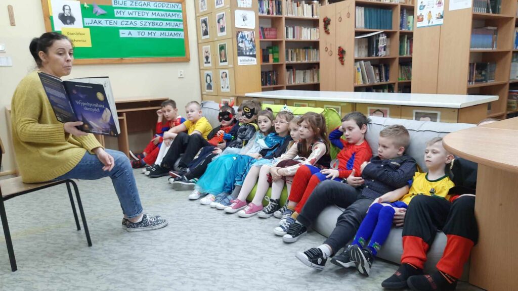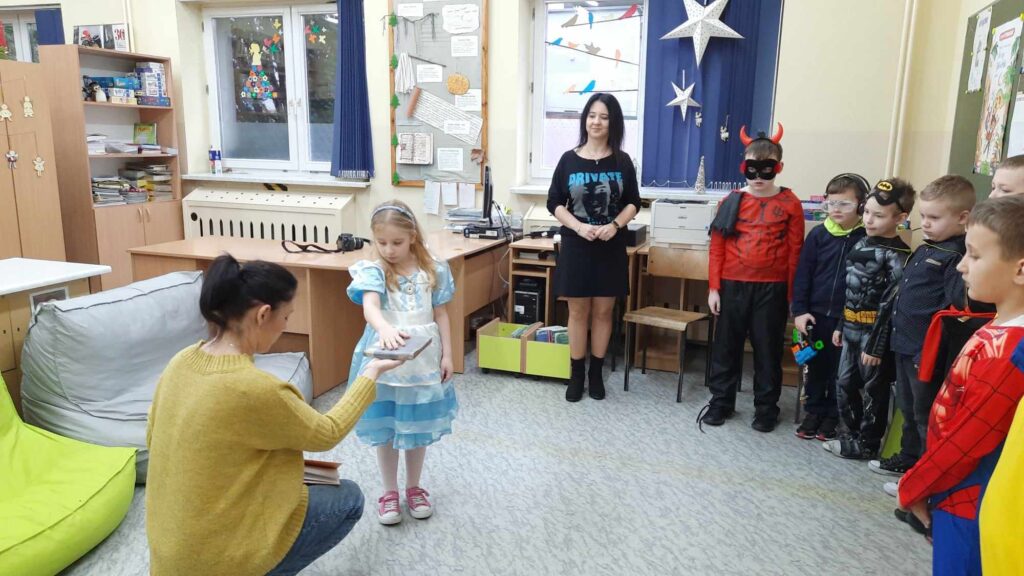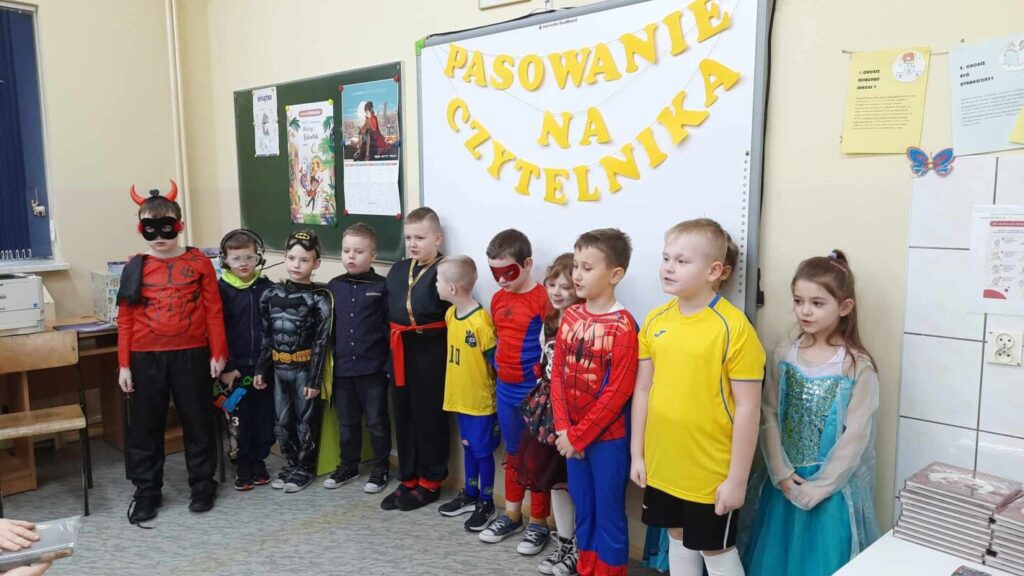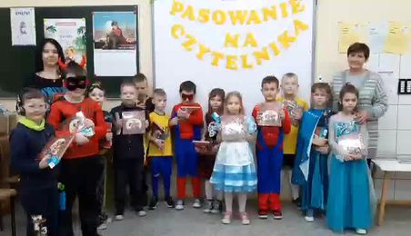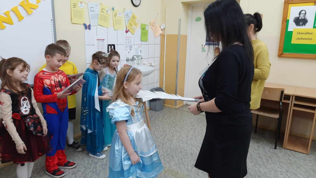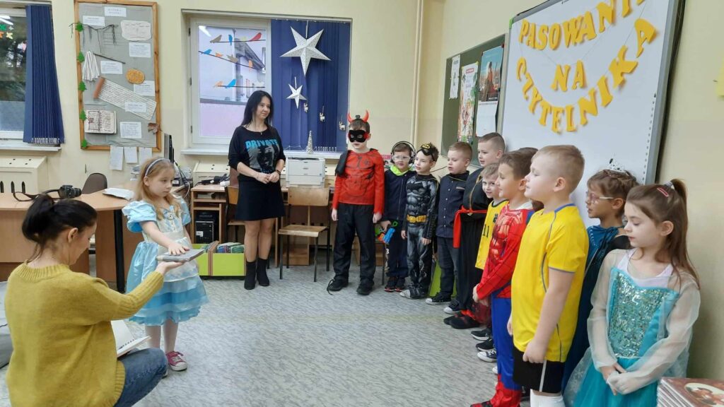 Tegoroczne pasowanie na czytelnika miało bajeczną oprawę, ponieważ uczniowie odwiedzili bibliotekę szkolną w strojach karnawałowych. Wszyscy wyglądali bajecznie i kolorowo, w sam raz na spotkanie z baśniami i innymi książkami, które od tej pory mogą oficjalnie już wypożyczać.