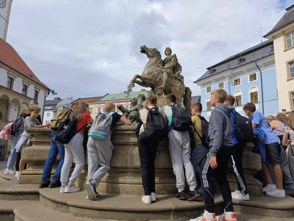 Pierwszego dnia udaliśmy się do pięknego miasteczka Ołomuniec na Morawach we wschodniej części Czech. To drugi co do wielkości rezerwat zabytków w całej Republice Czeskiej. Spacer po tym pięknym mieście rozpoczęliśmy od kaplicy ukrytej w Kolumnie Trójcy Przenajświętszej. Ołomuniec to także i zdecydowanie czeskie miasto fontann. Następnie udaliśmy się pod ratusz, gdzie na północnej jego fasadzie umieszczono monumentalny astronomiczny zegar, którego bicie można posłuchać w samo południe. Odwiedziliśmy gotycką katedrę św. Wacława z najwyższą wieżą na Morawach. Zobaczyliśmy również naszą wybitną rodaczkę – noblistkę Marię Skłodowską – Curie w towarzystwie króla selfie – Edwarda VII, która widnieje na muralu, przypominając o obecności kobiet w nauce i symbolizując postęp naukowy.