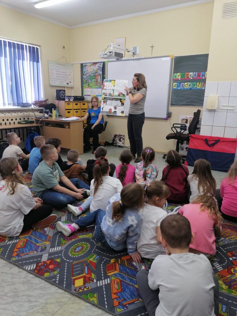 Pani Szelągowska opowiadała, jak powstaje treść książki, skąd czerpie inspiracje. Autorka zapoznała uczniów ze swoimi utworami poprzez czytanie opowiadań i wierszyków. W tle przewijały się obrazy wykonane w technice kolażu nawiązujące do prezentowanej treści. Pani Jędrychowska tłumaczyła uczniom, jak skomplikowanym procesem jest stworzenie szaty graficznej książki.
