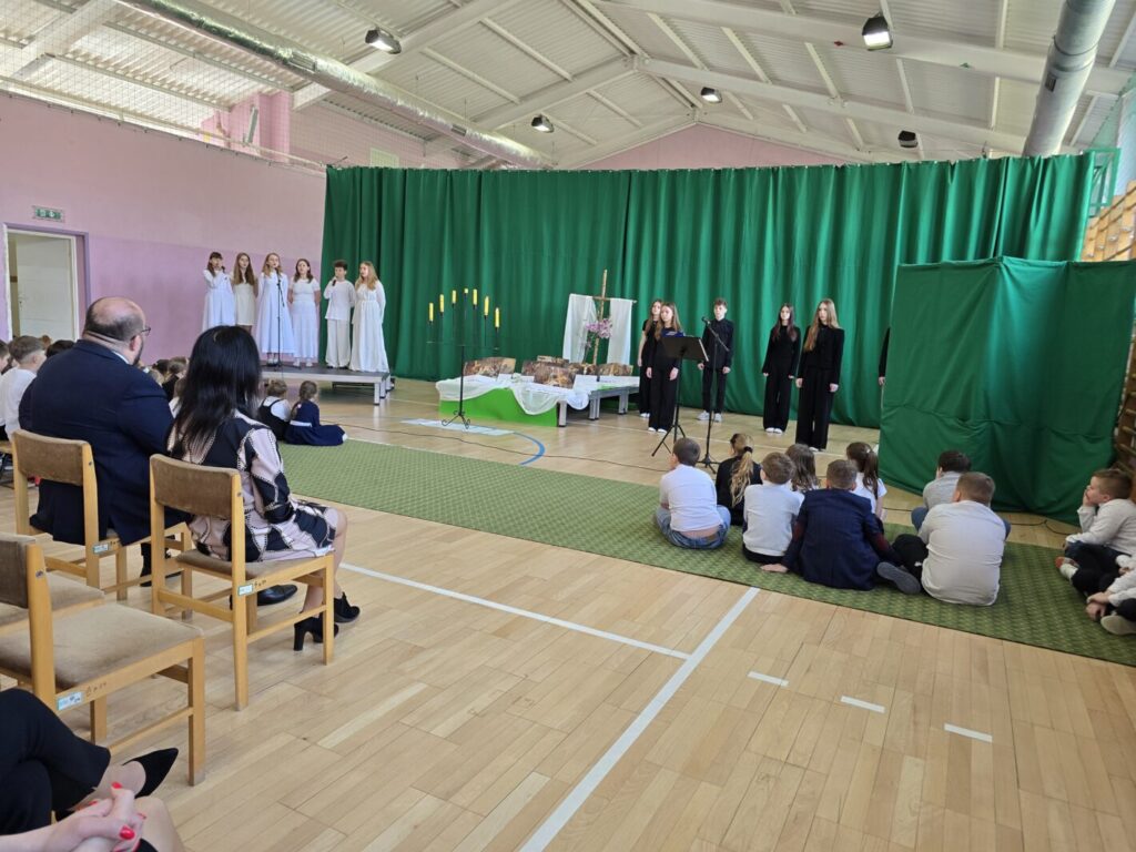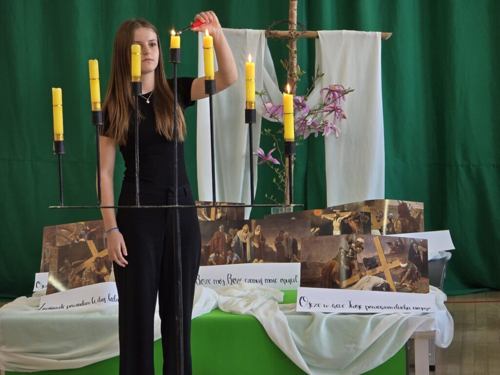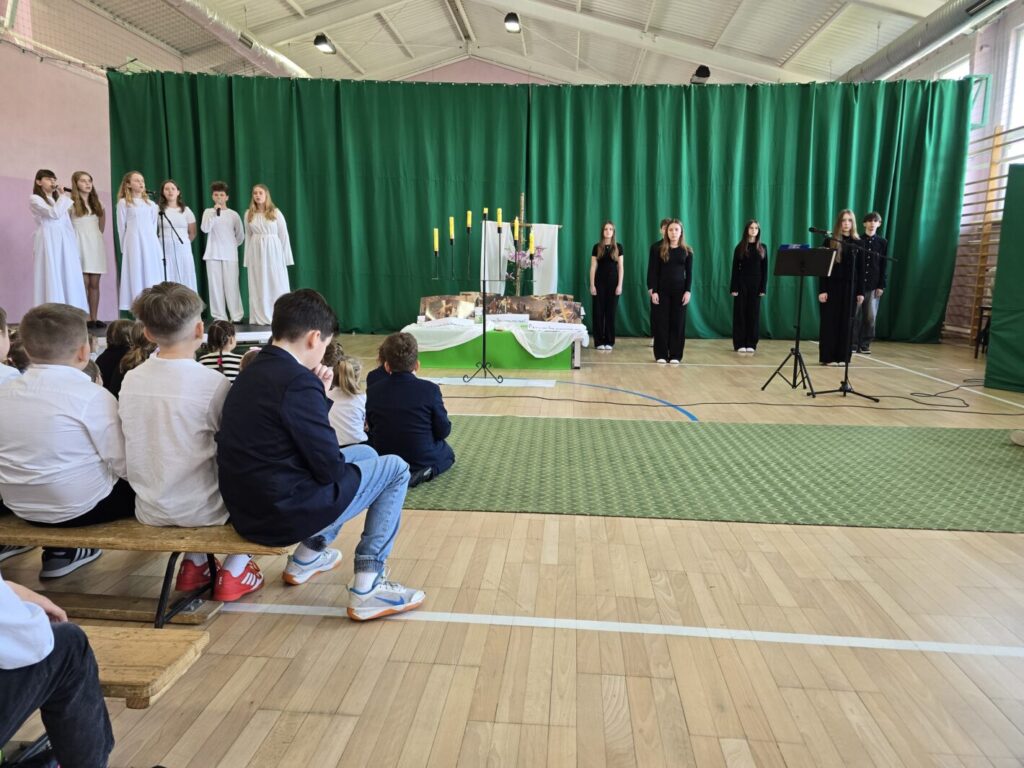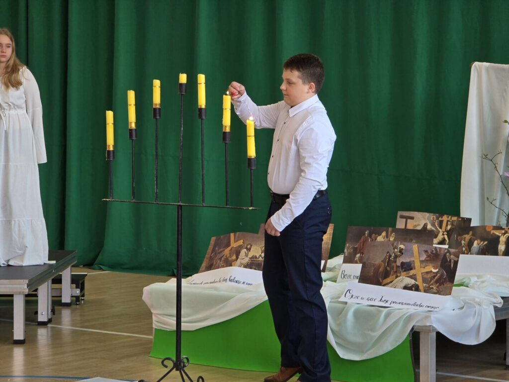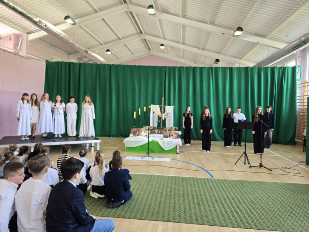 Wielkimi krokami zbliżają się Święta Wielkiej Nocy. W Wielkim Tygodniu, tuż przed przerwą świąteczną, uczniowie, nauczyciele i pozostali pracownicy naszej szkoły zebrali się na sali gimnastycznej, by wziąć udział w uroczystym apelu. Piękną oprawę do tego spotkania przygotowały panie Jolanta Kuropatwa oraz Aneta Jeziorska wraz z grupą uczniów, którzy zaprezentowali montaż słowno-muzyczny, inspirowany ostatnimi słowami Jezusa na krzyżu.