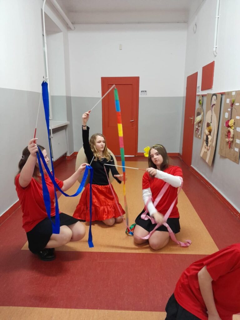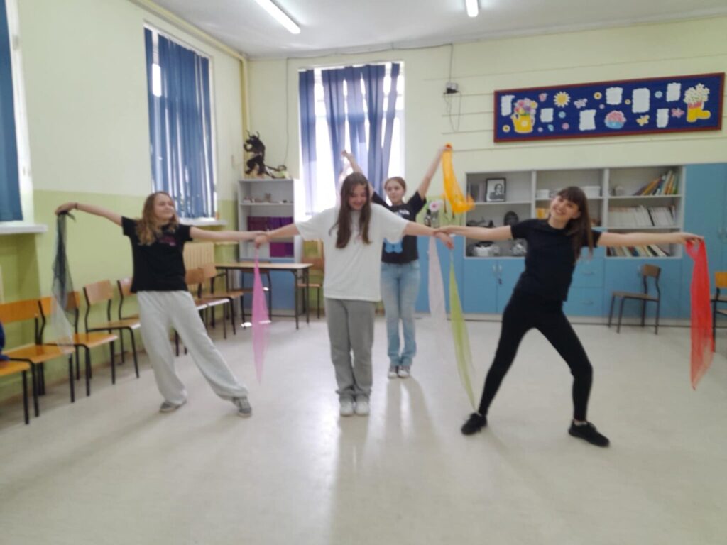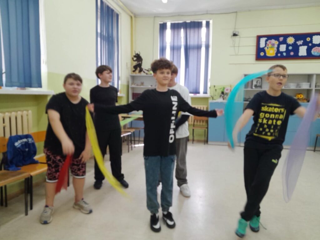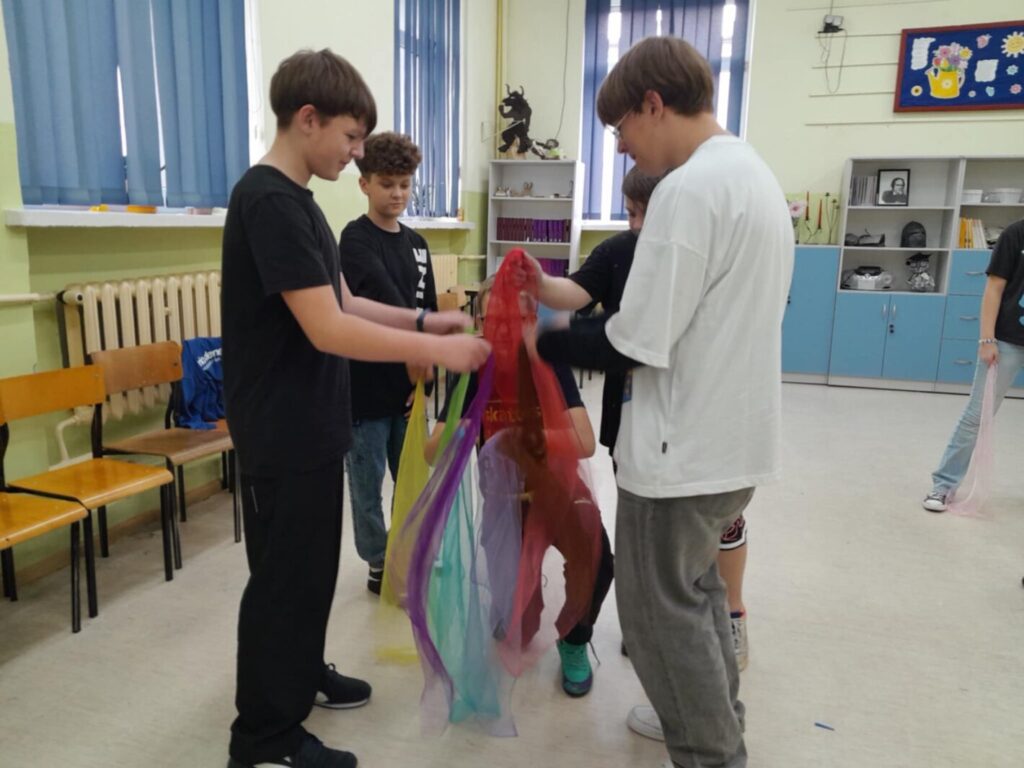 Koło teatralne to wyjątkowe miejsce, w którym uczniowie mogą rozwijać swoje pasje, odkrywać talenty sceniczne oraz zdobywać pewność siebie poprzez aktywność artystyczną. Podczas spotkań w ramach zajęć projektowych 2.3–1 i 2.3-2 uczniowie rozwijali swoje umiejętności aktorskie: kreatywność, wyrażanie emocji oraz świadomego korzystania z głosu, ruchu i gestu. Na zajęciach z improwizacji budowali dialogi, tworzyli sytuacje sceniczne bez scenariusza. Szybko okazało się, że improwizacja to nie tylko dobra zabawa, ale też doskonałe ćwiczenie na uważność, odwagę i otwartość. Nie zabrakło również ćwiczeń na emisję głosu i dykcję, które pozwoliły każdemu aktorowi odkryć pełnię możliwości swojego głosu. Praca nad mimiką i gestykulacją uwolniła ekspresję ciała, a warsztaty pantomimy pokazały, że można opowiadać historie i wzbudzać emocje… bez użycia ani jednego słowa! Ważną częścią zajęć była również analiza krótkiego tekstu literackiego i próby jego interpretacji. To właśnie tutaj uczniowie ćwiczyli umiejętność czytania „między wierszami” i wydobywania z tekstu tego, co najistotniejsze. Towarzyszyły temu rozmowy o emocjach w aktorstwie – jak je odczuwać, jak pokazywać, jak nimi grać. Jednym z najbardziej kreatywnych momentów zajęć było tworzenie własnych, krótkich scenariuszy, które potem posłużyły jako baza do tworzenia scenek teatralnych. Praca w parach i grupach sprzyjała rozwijaniu umiejętności współpracy, a także synchronizacji ruchów i wspólnego tworzenia przekazu scenicznego. Nie obyło się bez zabaw ruchowych z chustą animacyjną i wstążką gimnastyczną, które stały się nie tylko narzędziem scenicznej ekspresji, ale i metaforą wspólnego tworzenia oraz ćwiczeń rozwijających koncentrację i pamięć – niezwykle ważnych w pracy aktora. Uczestnicy z zapałem ćwiczyli zapamiętywanie tekstu, odgrywanie dialogów oraz… improwizację na zadany temat, która często przeradzała się w prawdziwy spektakl emocji i śmiechu. Ogromne emocje wzbudziły ćwiczenia na wyrażanie uczuć, w których uczestnicy, często po raz pierwszy, musieli nazwać i zagrać takie stany jak złość, radość, strach czy smutek. To nie tylko warsztat teatralny, ale również cenne doświadczenie emocjonalne.