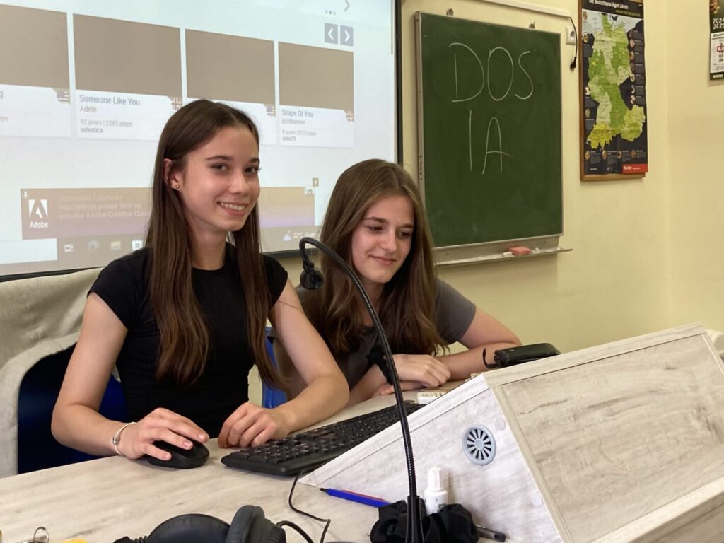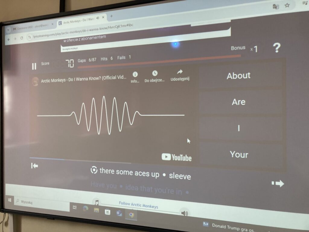 Podczas zajęć projektowych 2.2-3 i 2.2-4 uczniowie klas 7 i 8 wzięli udział w anglojęzycznej zabawie, w której wykorzystano m.in. słuchawki i tablicę interaktywną, co umożliwiło realizację zaplanowanych aktywności, takich jak: