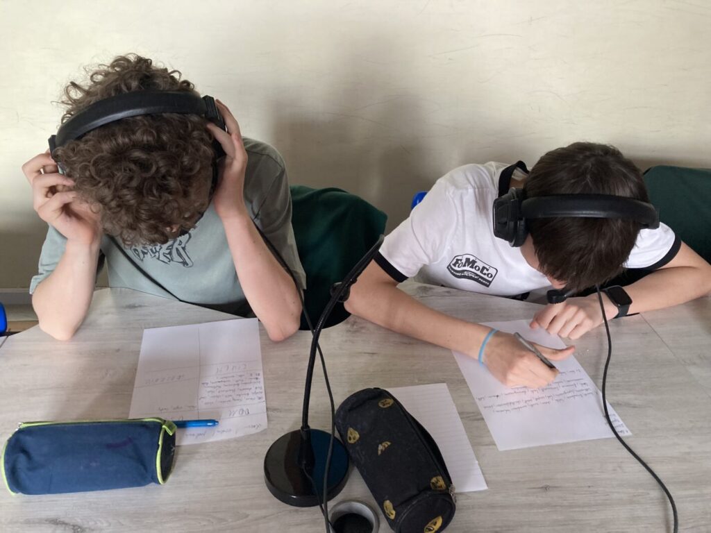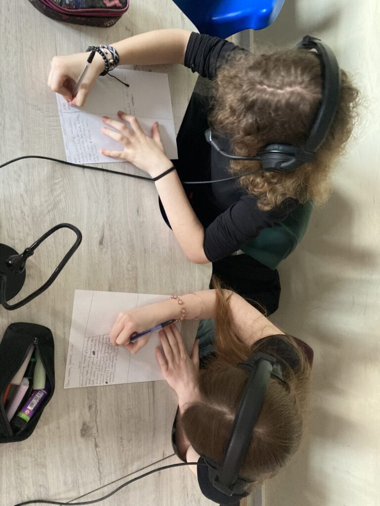 Słuchanie materiałów z użyciem słuchawek i tablicy interaktywnej.