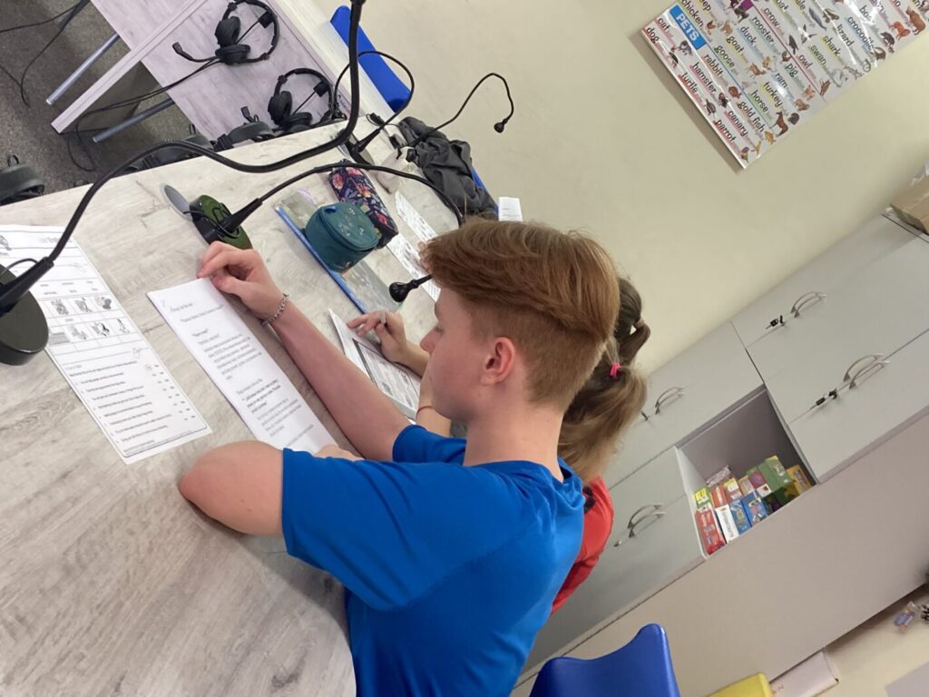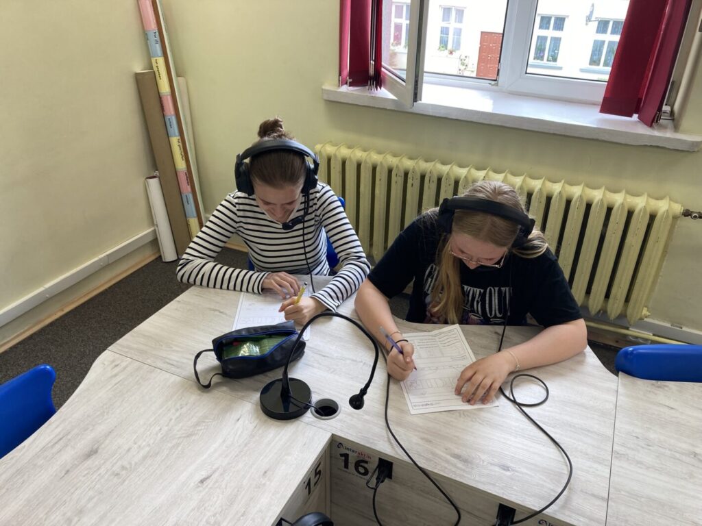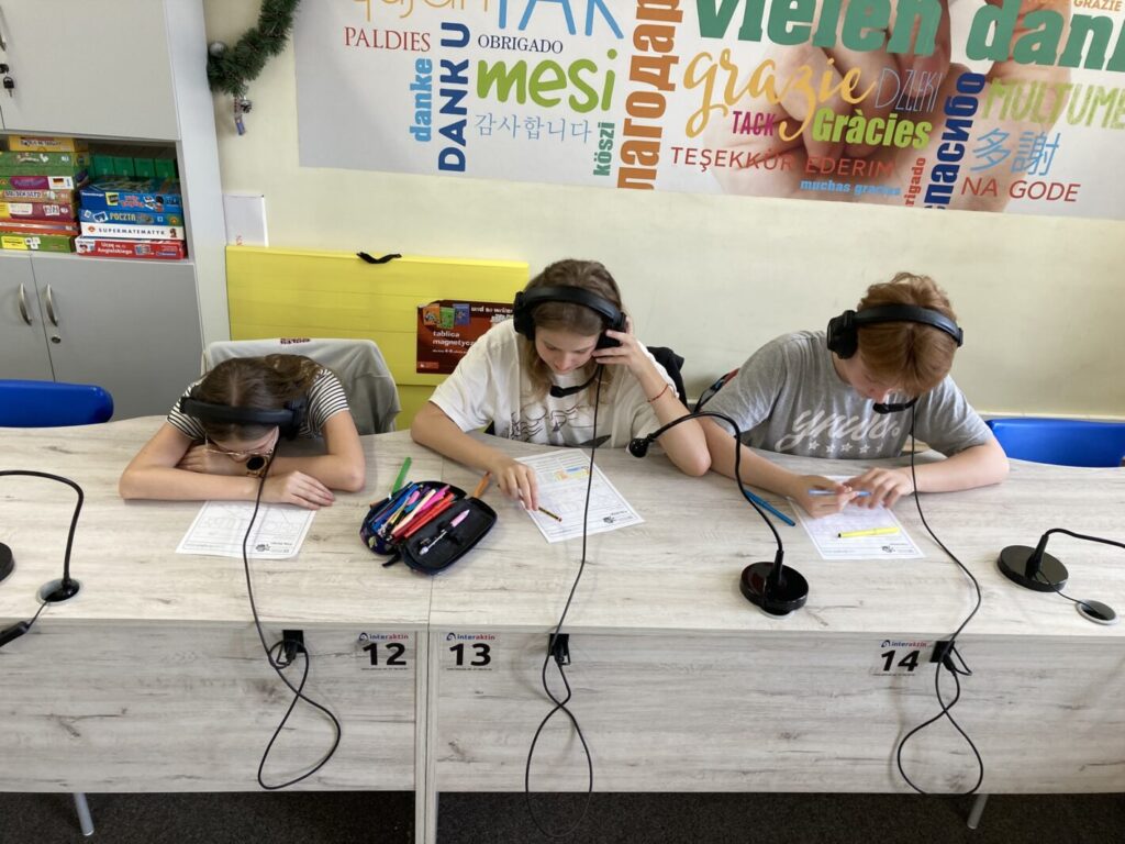 Ćwiczenia “na żywo” z tablicą i słuchawkami w sali językowej.