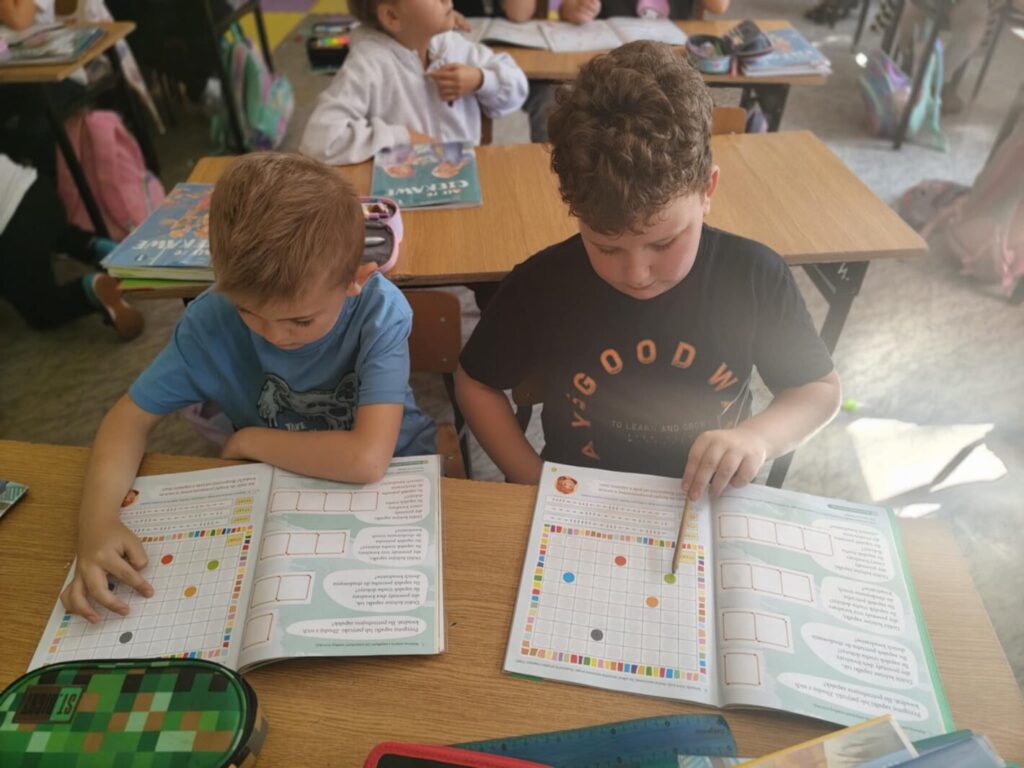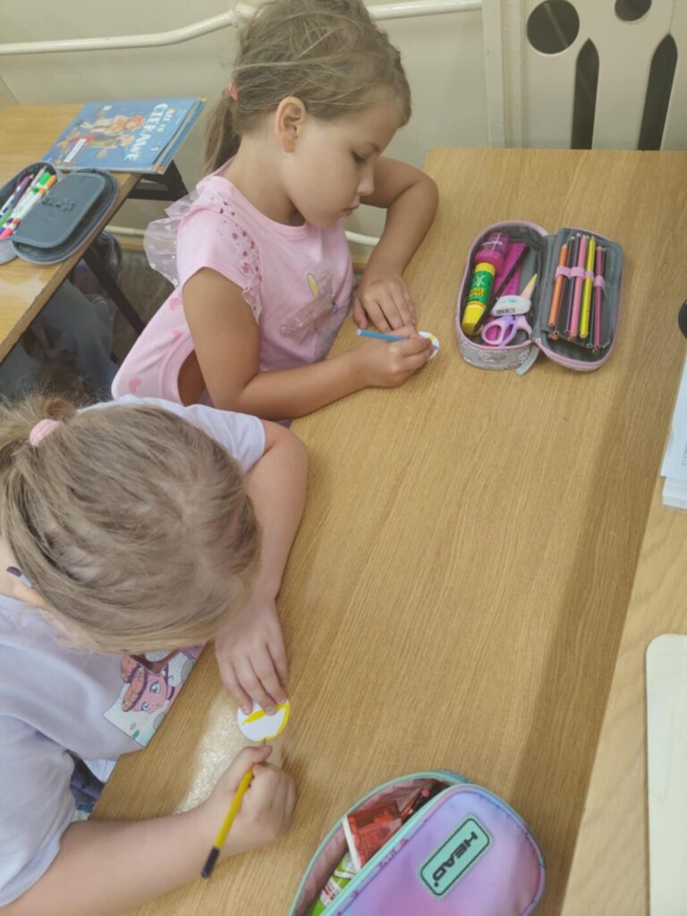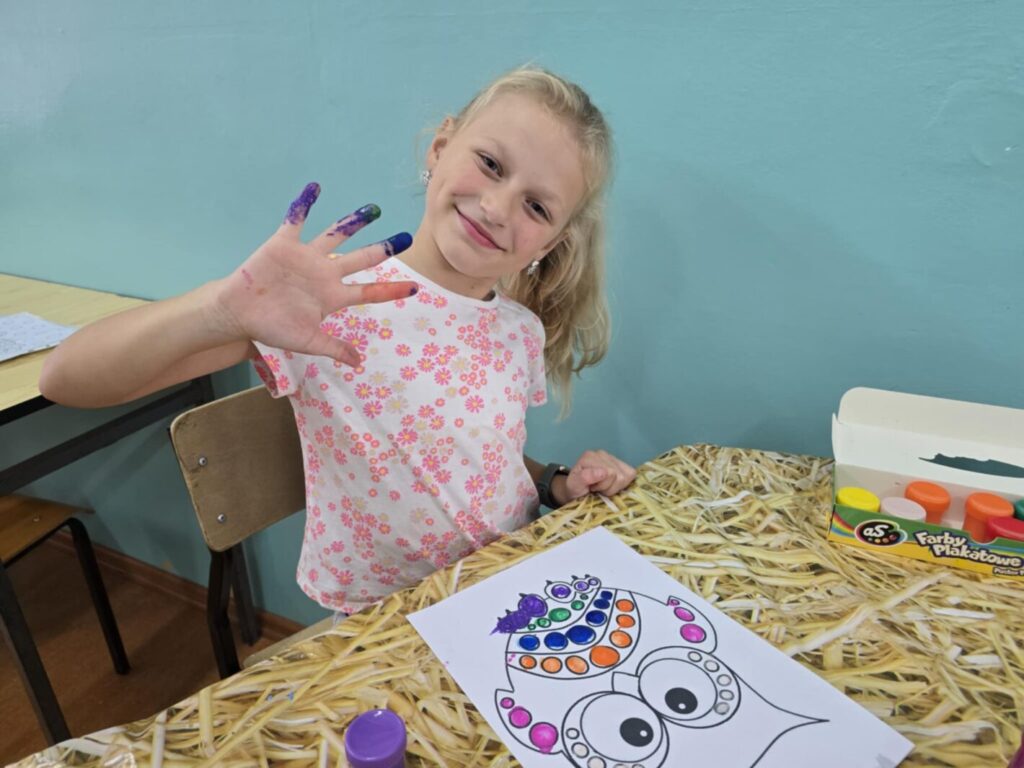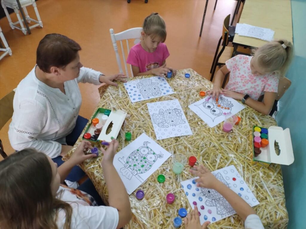 Również do szkolnej świetlicy zawitało kropkowe szaleństwo – tutaj uczniowie kolorowali ilustracje kropkami z farb, tworząc wielobarwne dzieła własnymi palcami, bez użycia pędzli.