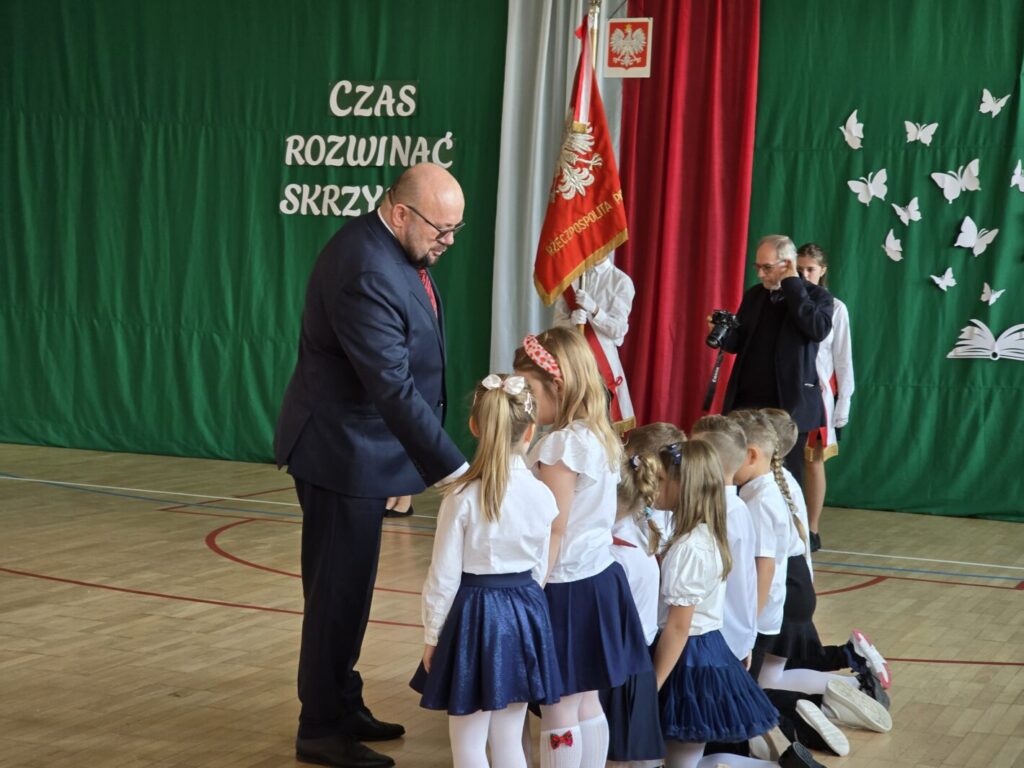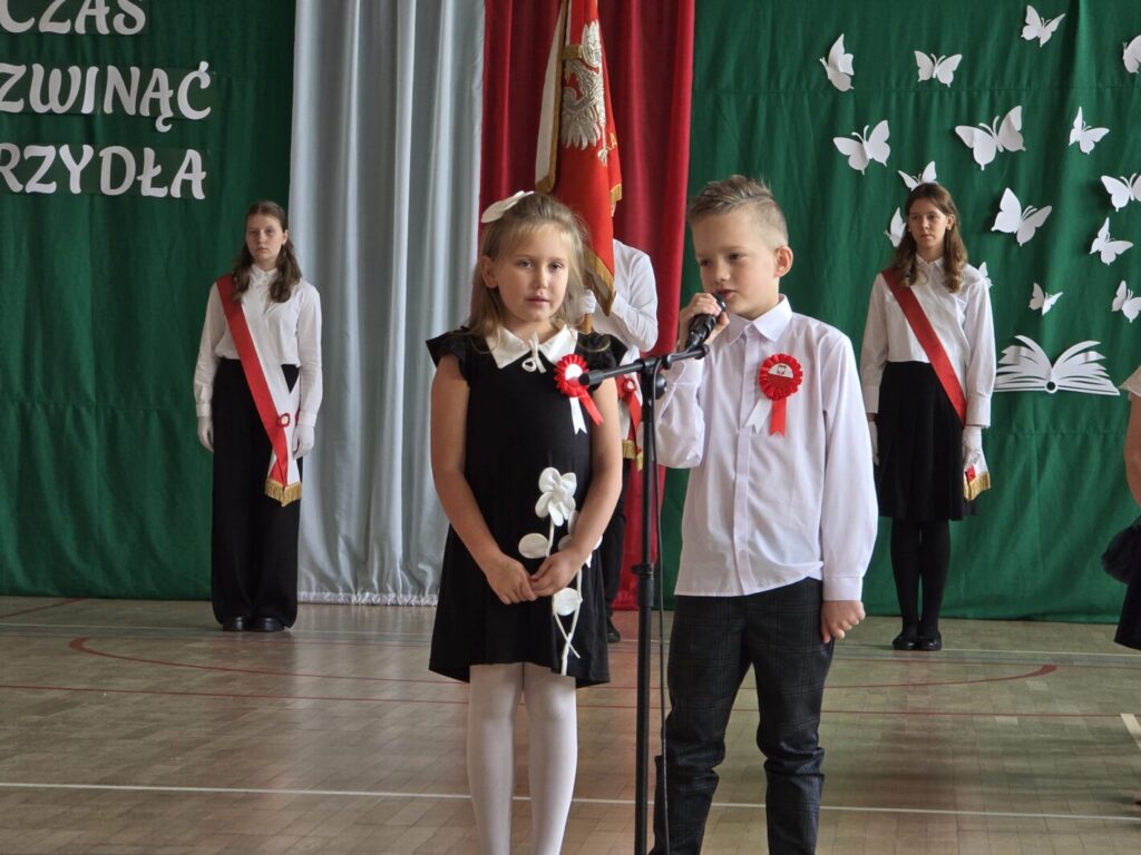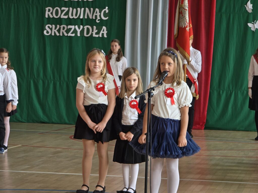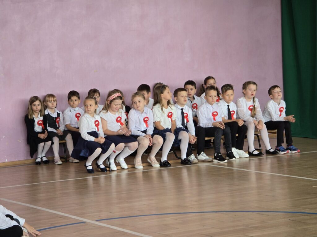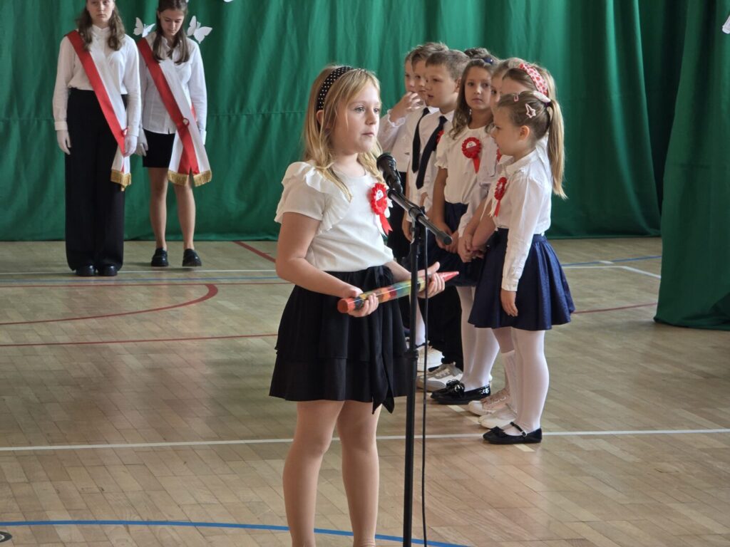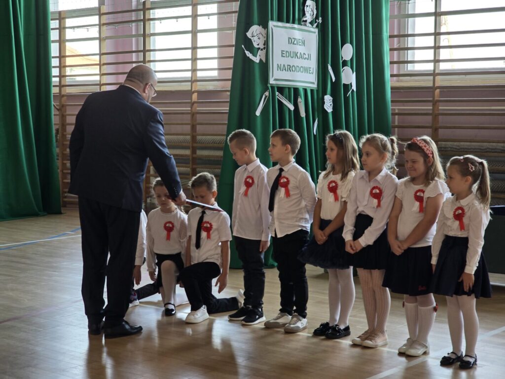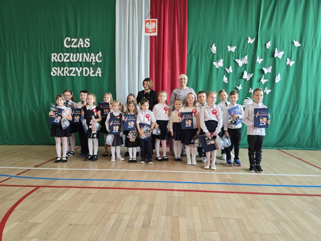 Nie był to jednak jedyny powód do świętowania, bowiem tradycją naszej placówki jest, że w tym dniu uczniowie klasy pierwszej zostają oficjalnie przyjęci do społeczności szkolnej poprzez pasowanie na ucznia. Podczas uroczystości pierwszoklasiści po raz pierwszy wystąpili przed starszymi koleżankami i kolegami, gronem pedagogicznym, zaproszonymi gośćmi oraz rodzicami i świetnie poradzili sobie z tym wyzwaniem. Nie zabrakło wspólnych piosenek i wierszy, a przede wszystkim uroczyście złożonego ślubowania, a na koniec – pamiątkowych prezentów.