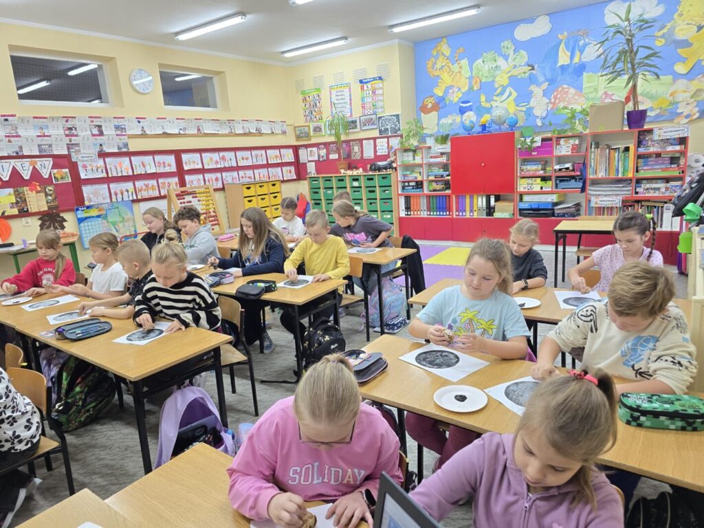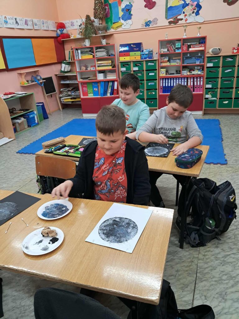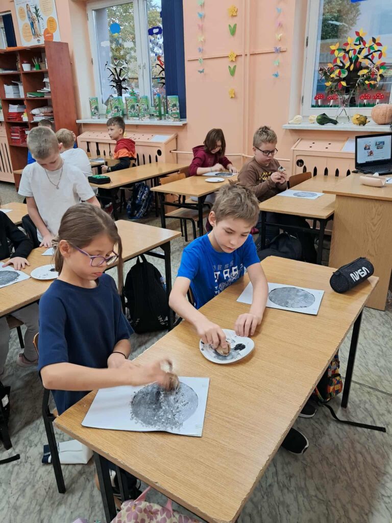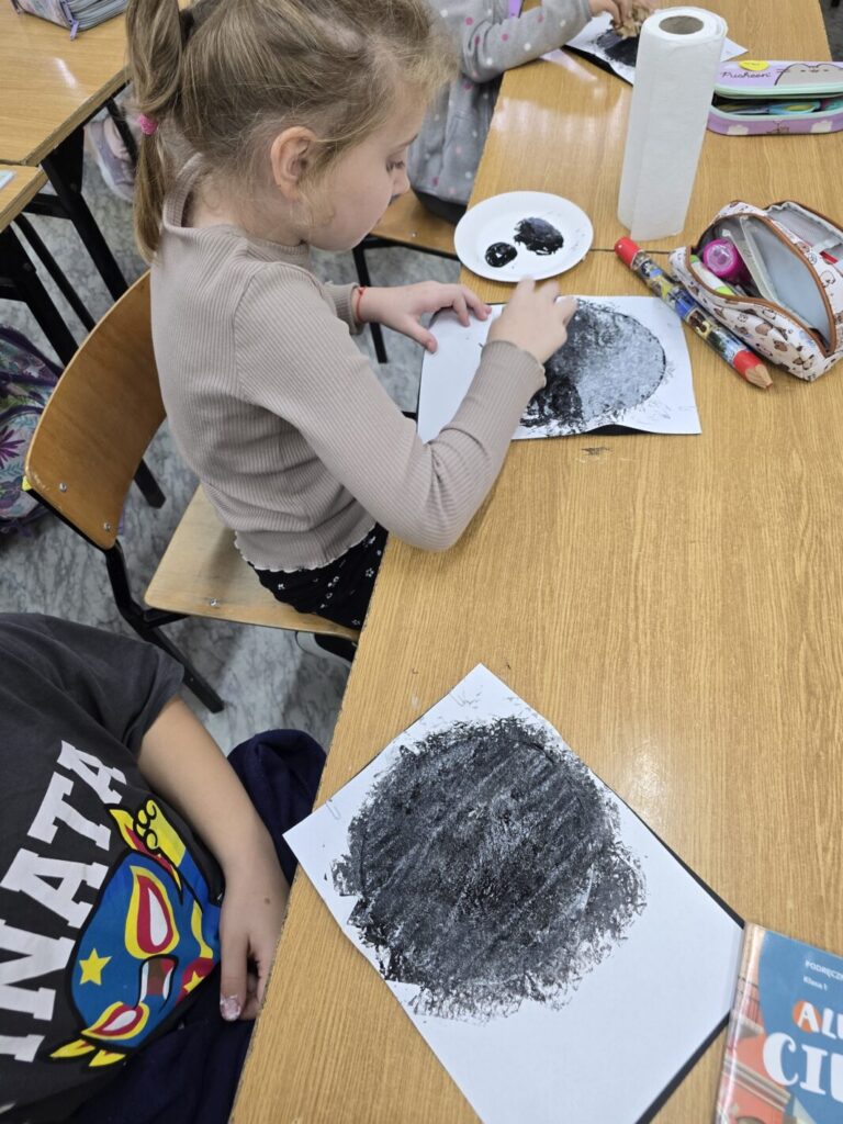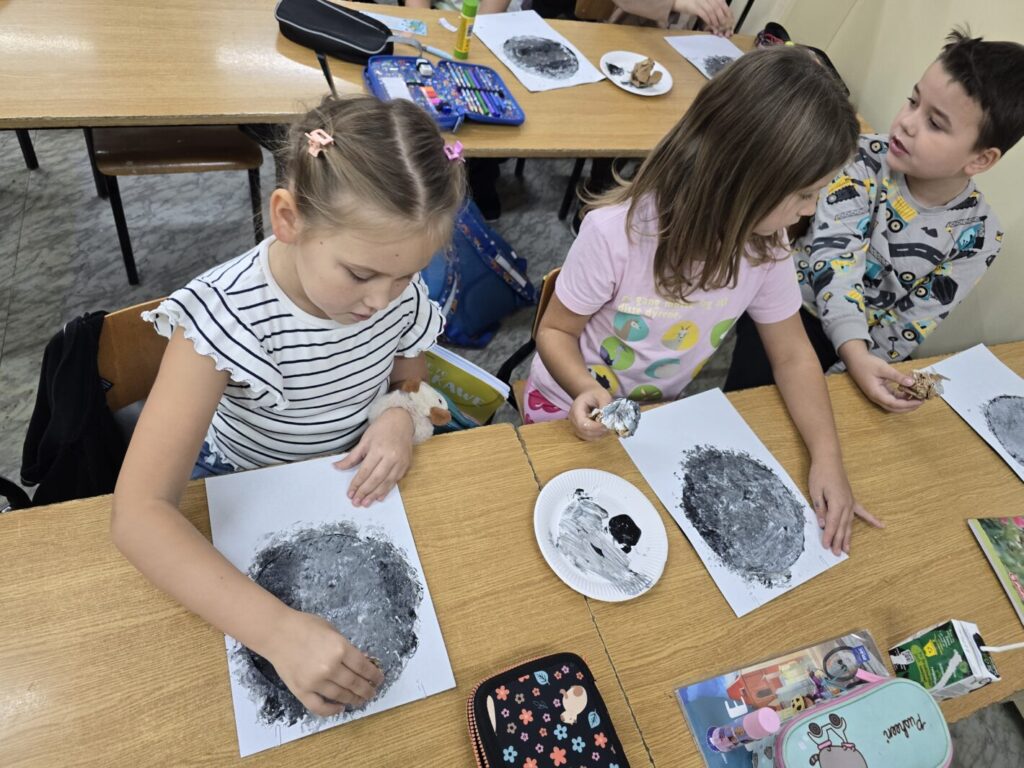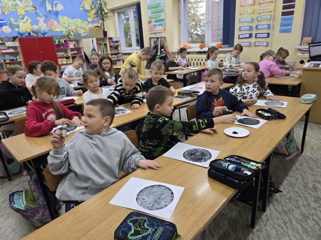 W każdej z klas odbyły się zajęcia, w trakcie których dzieci wysłuchały w nocnej scenerii (nad ich głowami “świecił” księżyc na rozgwieżdżonym niebie, wyświetlany z projektora) dzieła literackiego, tj. opowiadania “Księżyc” z tomu “Pan Kuleczka”, a następnie wykonały własne dzieła plastyczne – księżyce na nocnym niebie.