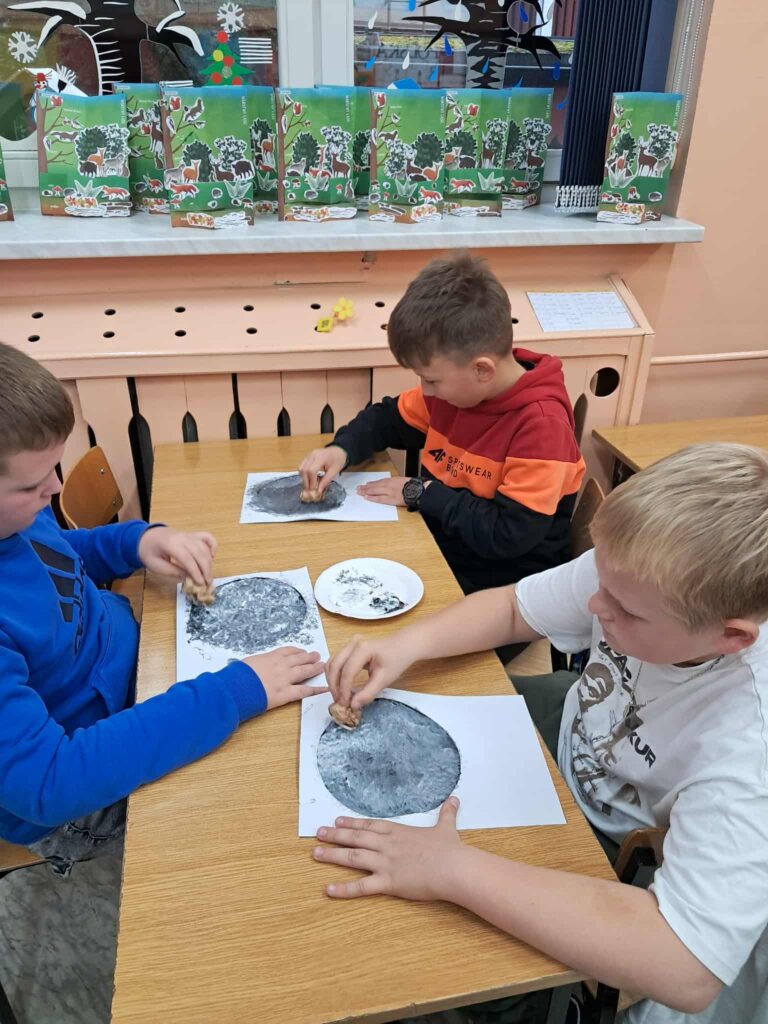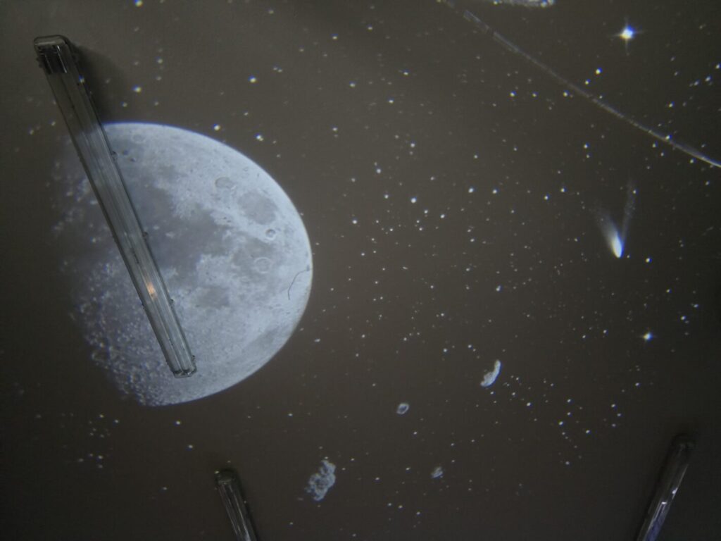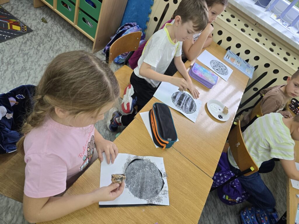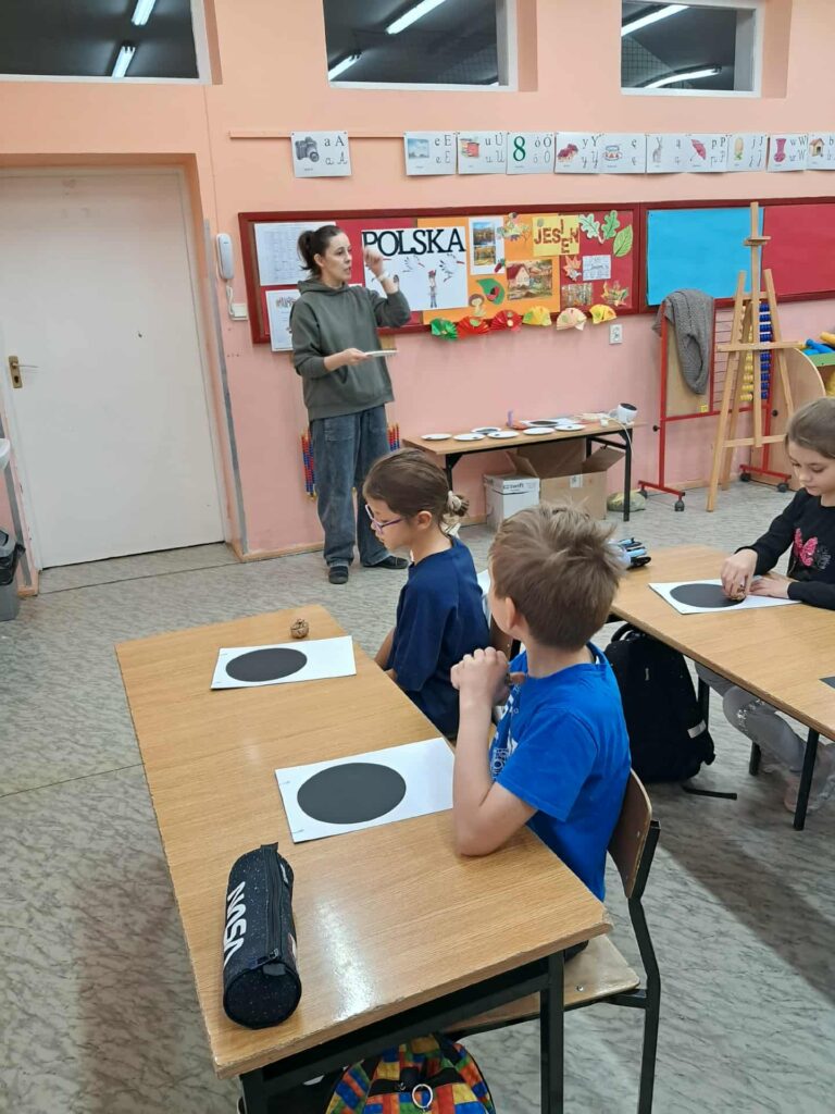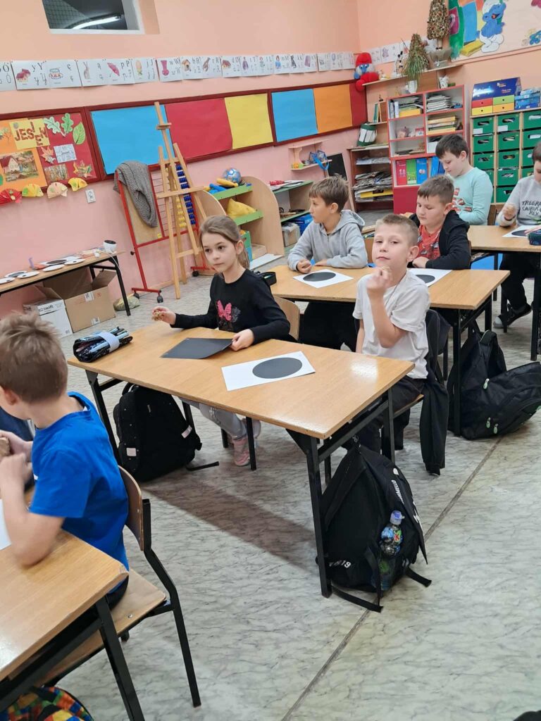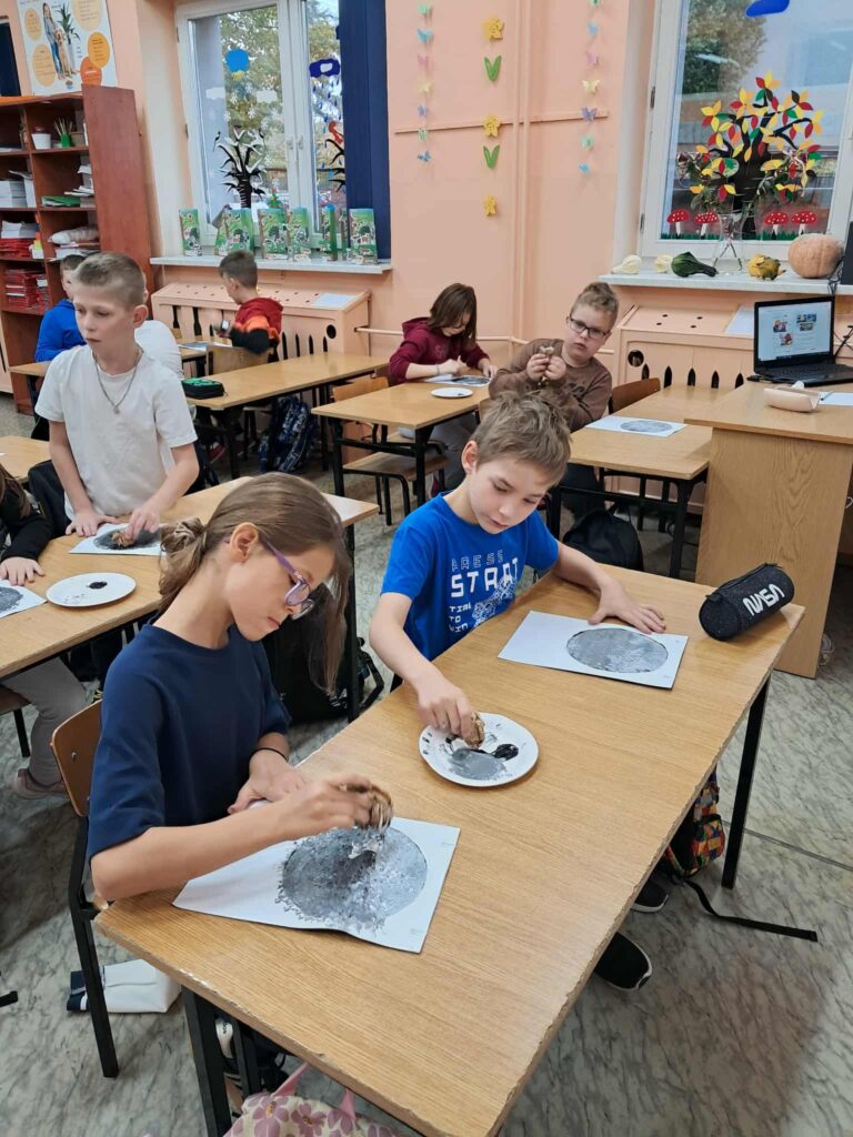 W każdej z klas odbyły się zajęcia, w trakcie których dzieci wysłuchały w nocnej scenerii (nad ich głowami “świecił” księżyc na rozgwieżdżonym niebie, wyświetlany z projektora) dzieła literackiego, tj. opowiadania “Księżyc” z tomu “Pan Kuleczka”, a następnie wykonały własne dzieła plastyczne – księżyce na nocnym niebie.