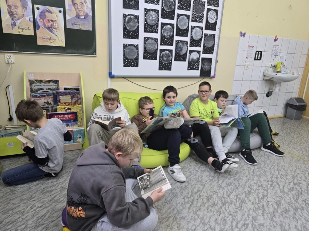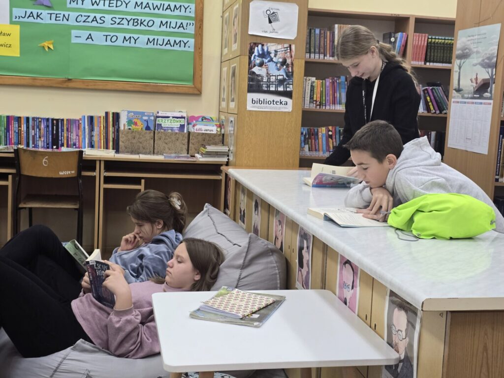 Jednym z nich jest “Przerwa na czytanie” – akcja, której ideą jest dobrowolne czytanie podczas przerw międzylekcyjnych dowolnej książki (ale nie lektury). Wyjątkiem są uczniowie nauczania początkowego, którzy biorą udział w akcji poprzez wysłuchanie czytanego tekstu.