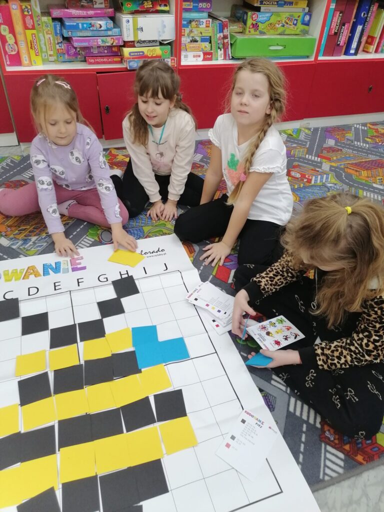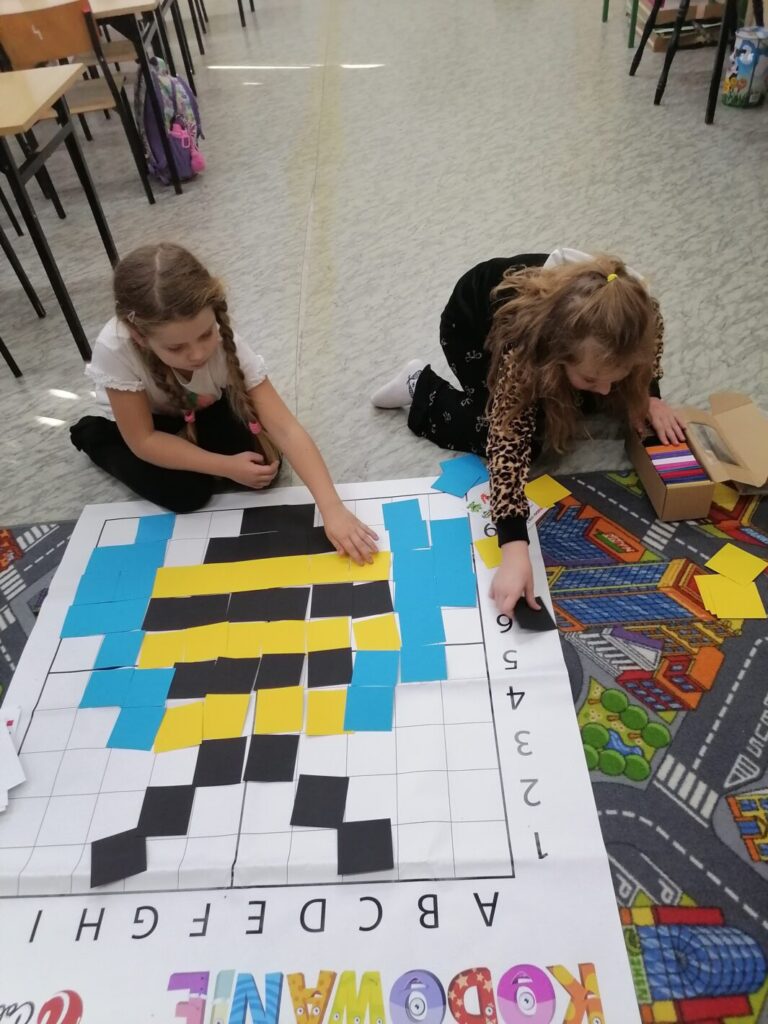 Podczas zajęć projektowych 2.1-1 uczniowie klasy I rozwijali umiejętności matematyczne i przyrodnicze poprzez zabawę. Dzieci odczytywały proste kody i instrukcje, a następnie układały na matach oraz kartach pracy zwierzęta i rośliny zgodnie z podanym schematem. Ćwiczyły orientację w przestrzeni (prawo, lewo, góra, dół), logiczne myślenie oraz koncentrację.