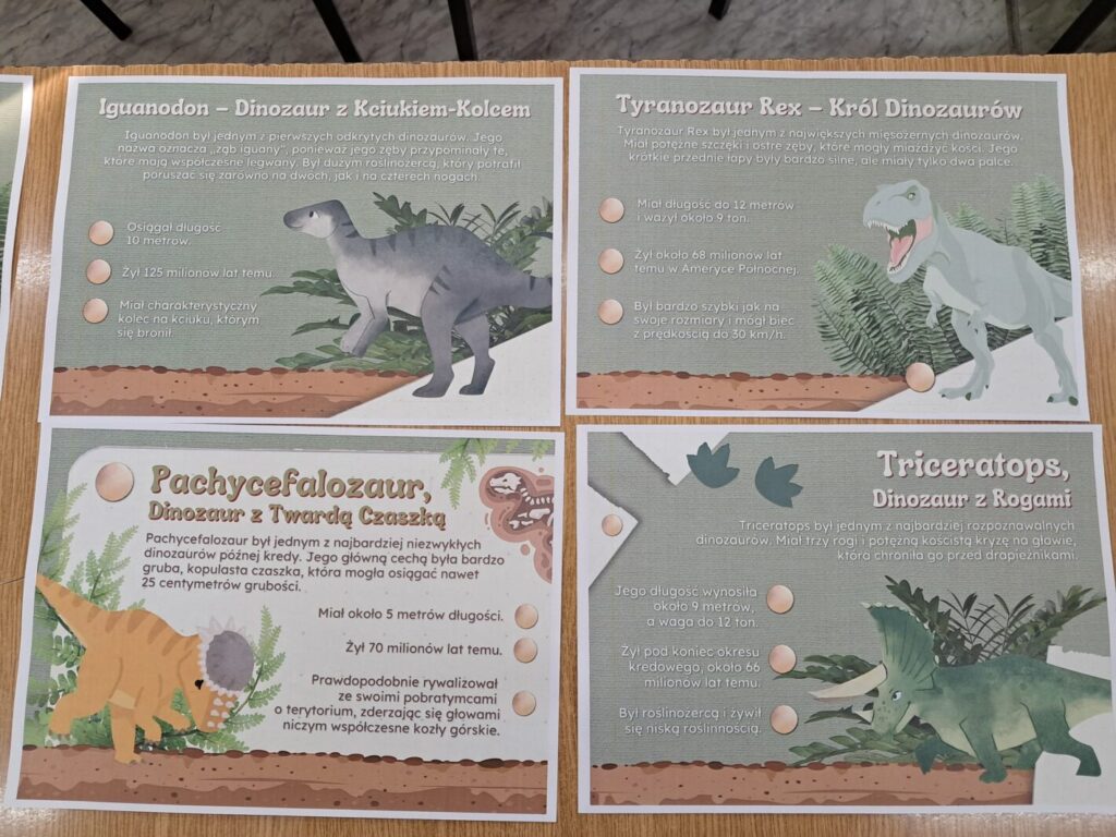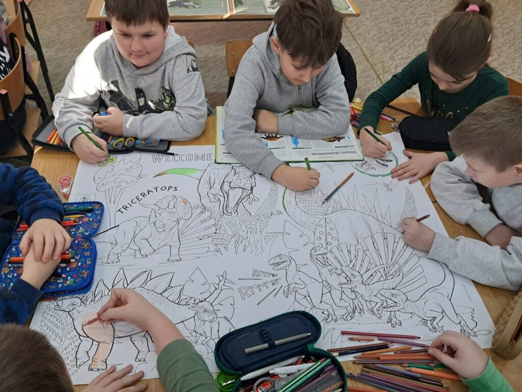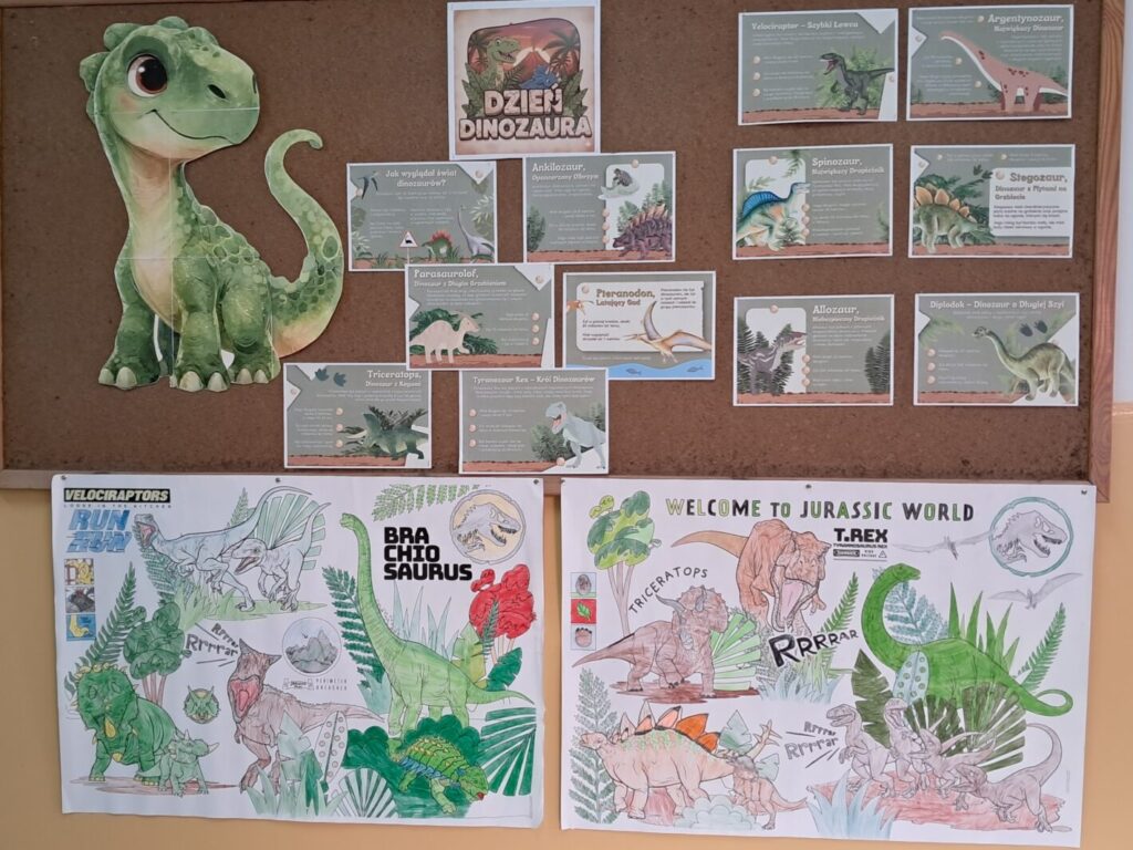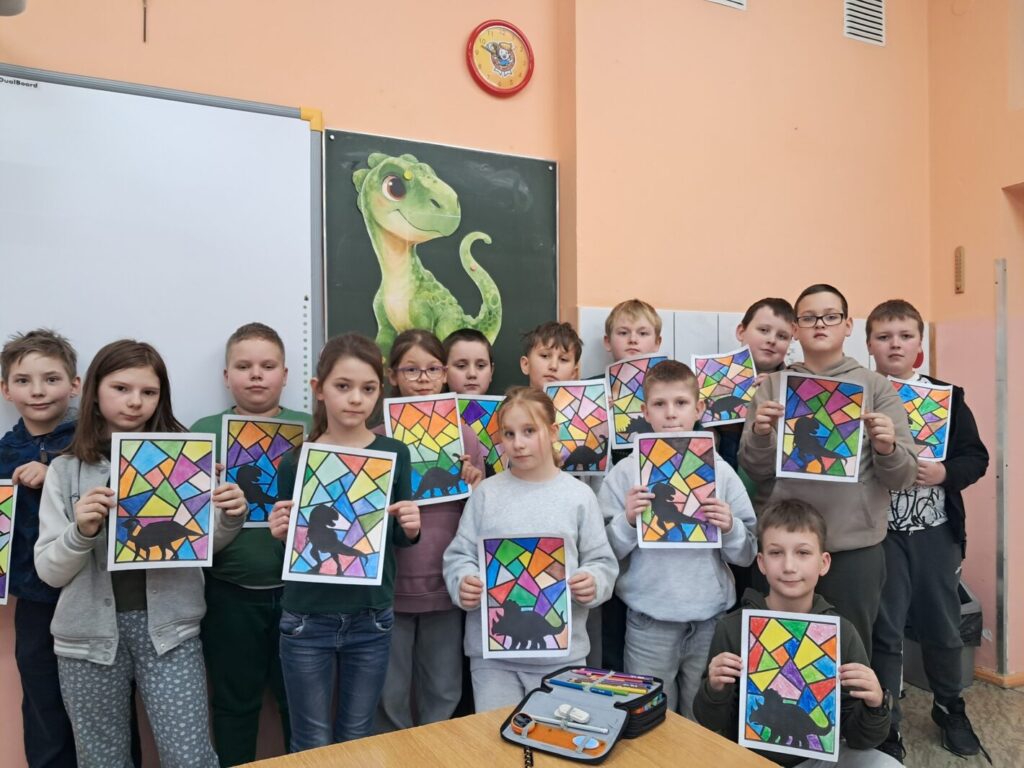 Dzisiejszy dzień (26 lutego) upłynął nam pod znakiem prehistorii! Nasza klasa wypełniła się kolorem zielonym, a korytarze opanowali fani paleontologii. Moi uczniowie udowodnili, że o dinozaurach wiedzą niemal wszystko! Podczas zajęć rozpoznawaliśmy gatunki i zgłębialiśmy fascynujące fakty o warunkach życia dinozaurów w erze mezozoicznej. Wiemy już, który był najszybszy, a który najbardziej żarłoczny! Ławki szkolne na chwilę zamieniły się w wystawę – dzieci przyniosły swoje ulubione modele oraz maskotki, które towarzyszyły im podczas zajęć. Podczas warsztatów plastycznych powstały barwne malowanki i efektowne dino-witraże, które teraz zdobią nasze korytarze. To była niesamowita lekcja historii naturalnej.