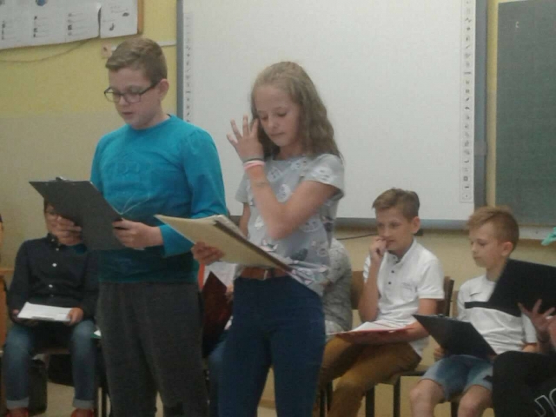 7 czerwca 2018 r. uczniowie klasy piątej zaprezentowali uczniom z klasy 6 i 7 oraz drugiej gimnazjum program poetycki dotyczący życia i twórczości wielkiego polskiego poety Juliana Tuwima. Obecni na spotkaniu dowiedzieli się o losach twórcy z Łodzi, jego zainteresowaniach i talentach. Autor słynnych wierszy dla dzieci (ok. 40 ) jest znany również z tekstów piosenek, utworów kabaretowych oraz wierszy pełnych radości i miłości do ojczyzny. Publiczność zgromadzona w sali polonistycznej w skupieniu wysłuchała wielu wierszy i ciekawostek o poecie, a rozmowa po występie mocniej uzmysłowiła wszystkim, że Polacy mogą być dumni z tak wielkiego łodzianina, jakim był Julian Tuwim.