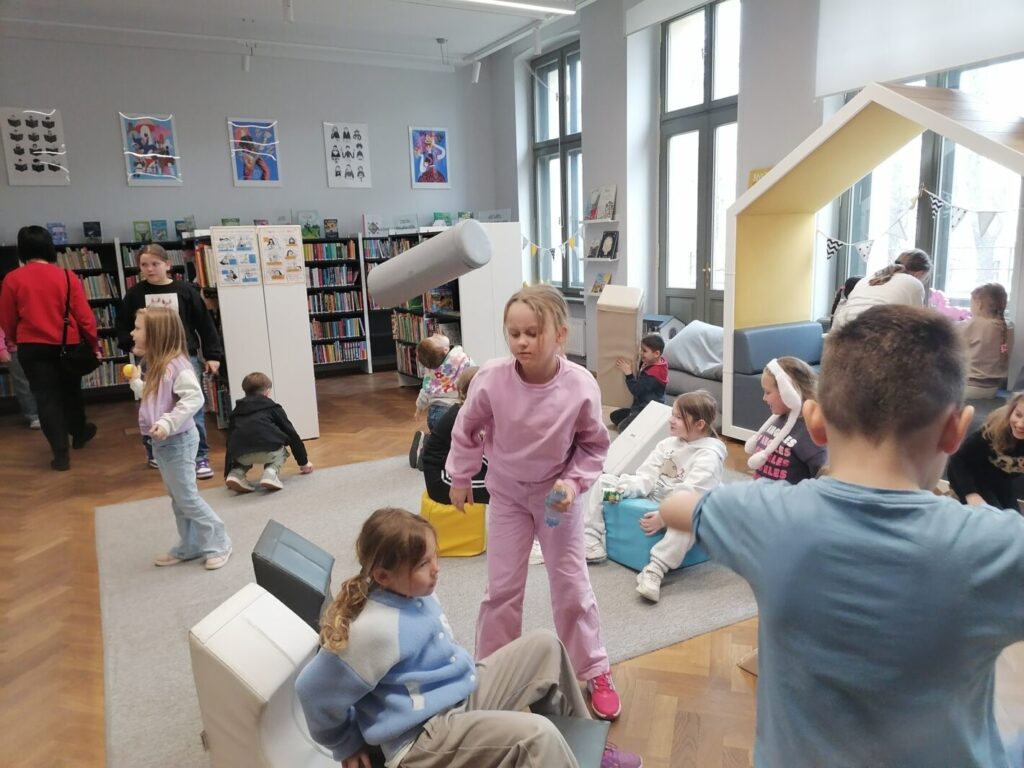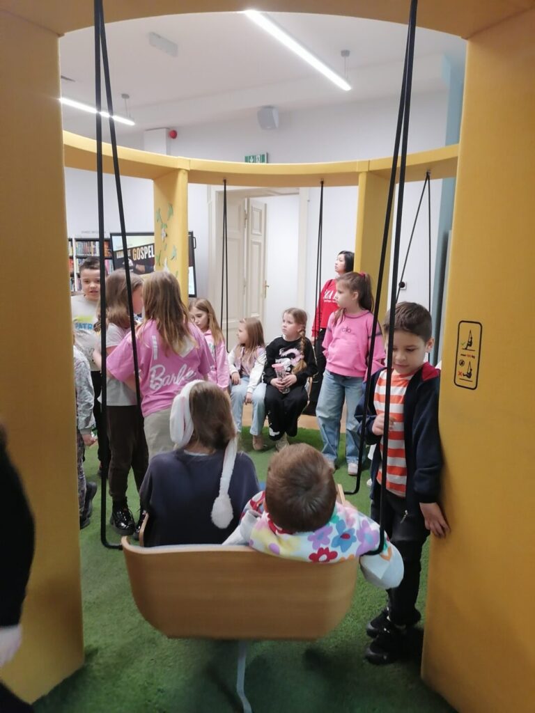 Po przyjeździe zostaliśmy serdecznie przywitani przez pracowników mediateki, którzy zapoznali nas z zasadami obowiązującymi w obiekcie oraz przedstawili plan zwiedzania. Uczniowie mieli okazję poznać różnorodne strefy tematyczne, dostosowane do ich wieku.