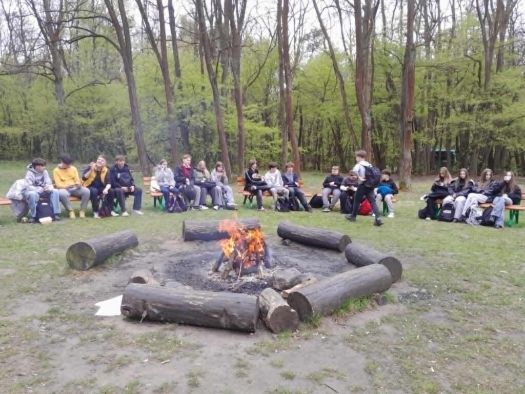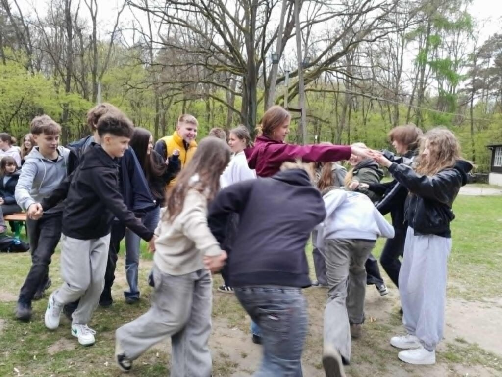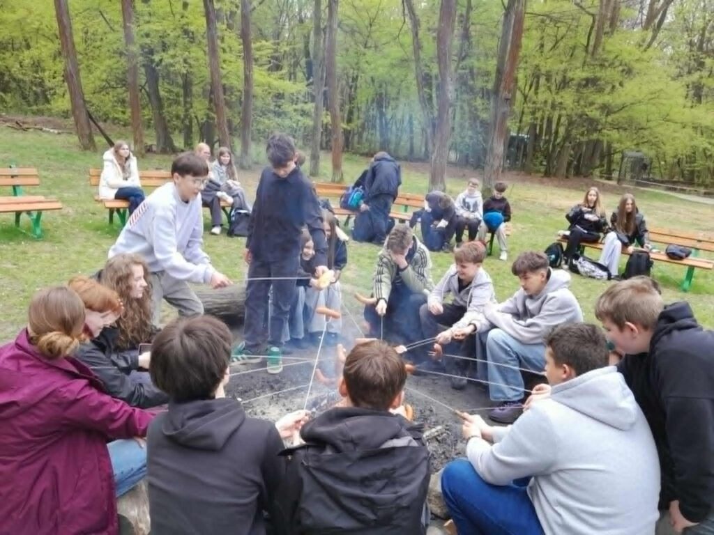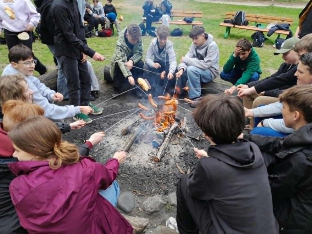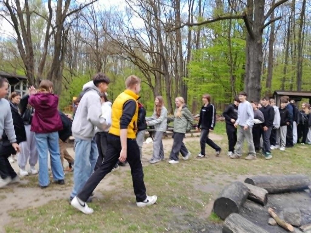 Zwieńczeniem tego intensywnego dnia było wspólne ognisko, które stało się okazją do zasłużonego odpoczynku i integracji. Przy cieple płomieni i zapachu pieczonych kiełbasek nie zabrakło radosnych śpiewów oraz tradycyjnych pląsów. Największym hitem okazały się „Jaworowe dzieci” – wspólna zabawa wywołała salwy śmiechu i pokazała, że uczniowie klas 6-8 potrafią bawić się z ogromnym dystansem i energią. Do szkoły wróciliśmy bogatsi o nowe umiejętności „przetrwania”.