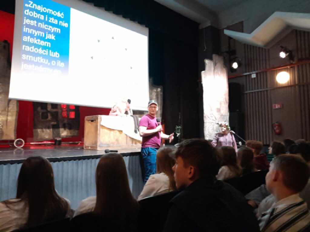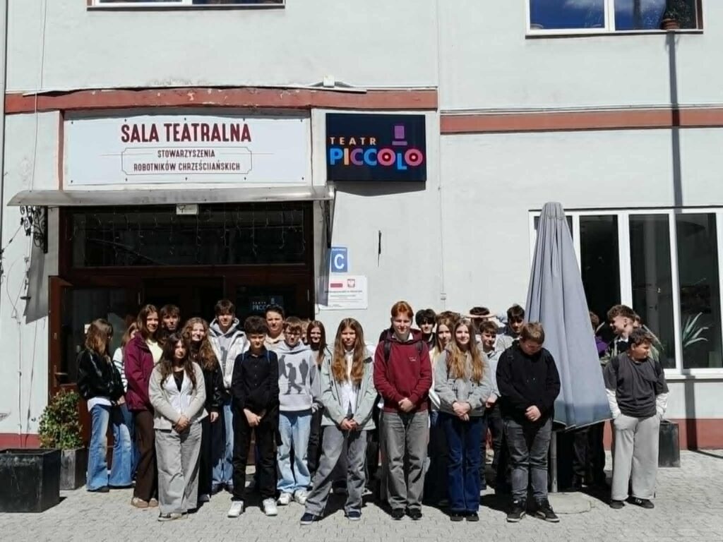 Naszą przygodę rozpoczęliśmy w Teatrze Piccolo, gdzie obejrzeliśmy spektakl pt. „W środku miasta”. To niezwykle trafne widowisko przeniosło nas w samo centrum wielkomiejskiego labiryntu, stając się punktem wyjścia do ważnej dyskusji. Sztuka w odważny sposób poruszyła trudne tematy, z którymi mierzy się współczesna młodzież: problem uzależnień, skomplikowane relacje rodzinne oraz bolesne poczucie zagubienia w świecie własnych emocji. Obserwując losy bohaterów, uczniowie mogli zobaczyć, jak destrukcyjne bywa tłumienie uczuć i jak kluczowe jest szukanie wsparcia u najbliższych. Przedstawienie skłoniło nas do głębokich refleksji nad tym, jak radzić sobie z presją otoczenia i jak budować autentyczne więzi w zgiełku codzienności.