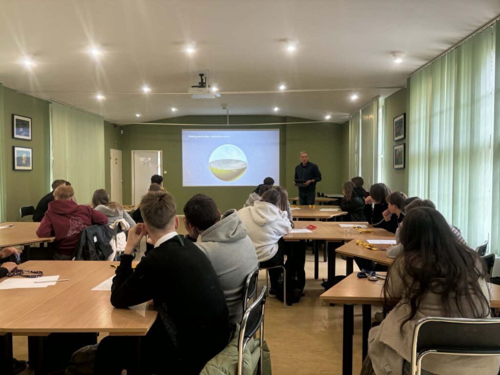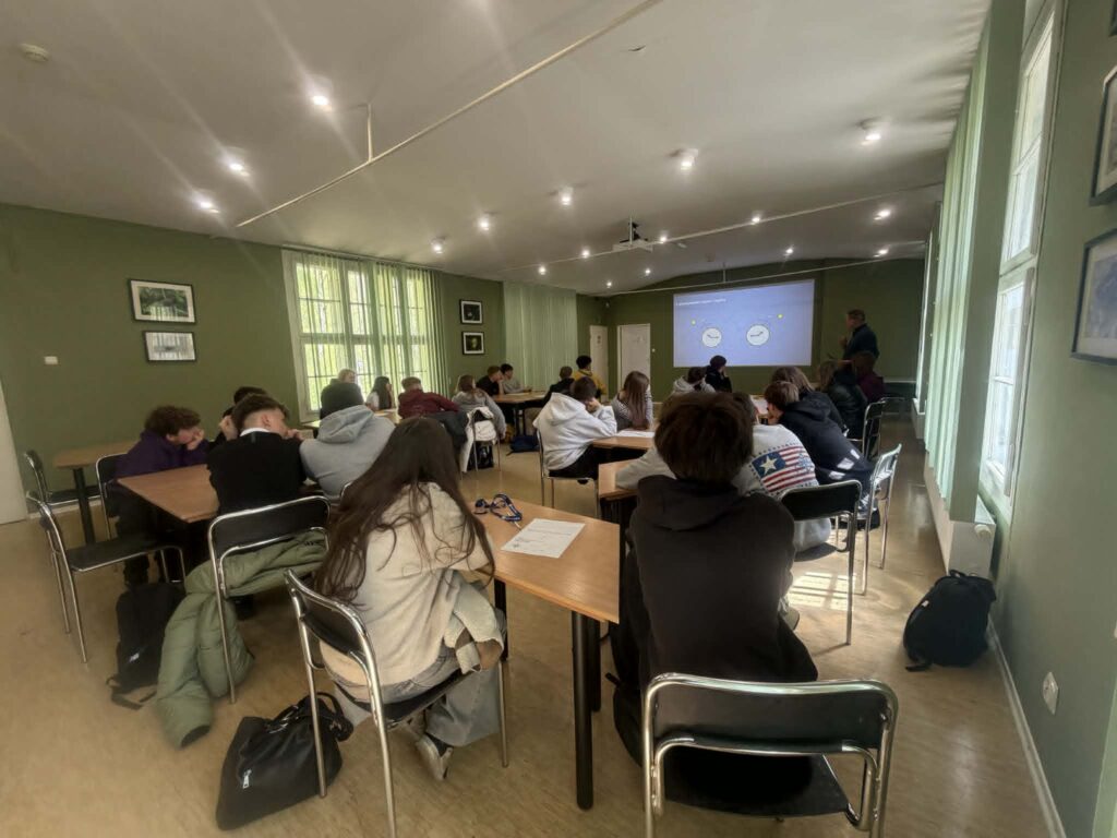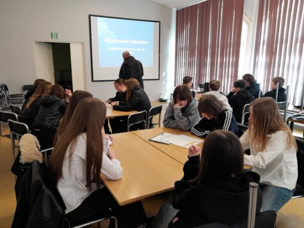 Z teatralnych foteli przenieśliśmy się prosto w zielone płuca Łodzi – do Ośrodka Edukacji Ekologicznej w Łagiewnikach. Naszą leśną przygodę rozpoczęliśmy od warsztatów teoretycznych, podczas których instruktorzy uczyli nas, jak prawidłowo odczytywać mapę, by nigdy nie zgubić się w lesie. Poznaliśmy tajniki skali, znaków topograficznych oraz metody orientowania mapy względem kierunków świata. Szczególną uwagę poświęciliśmy obsłudze busoli – nauczyliśmy się, jak wyznaczać azymuty i jak dzięki igle magnetycznej precyzyjnie odnajdywać kierunki w gęstym lesie, niezależnie od widoczności słońca.